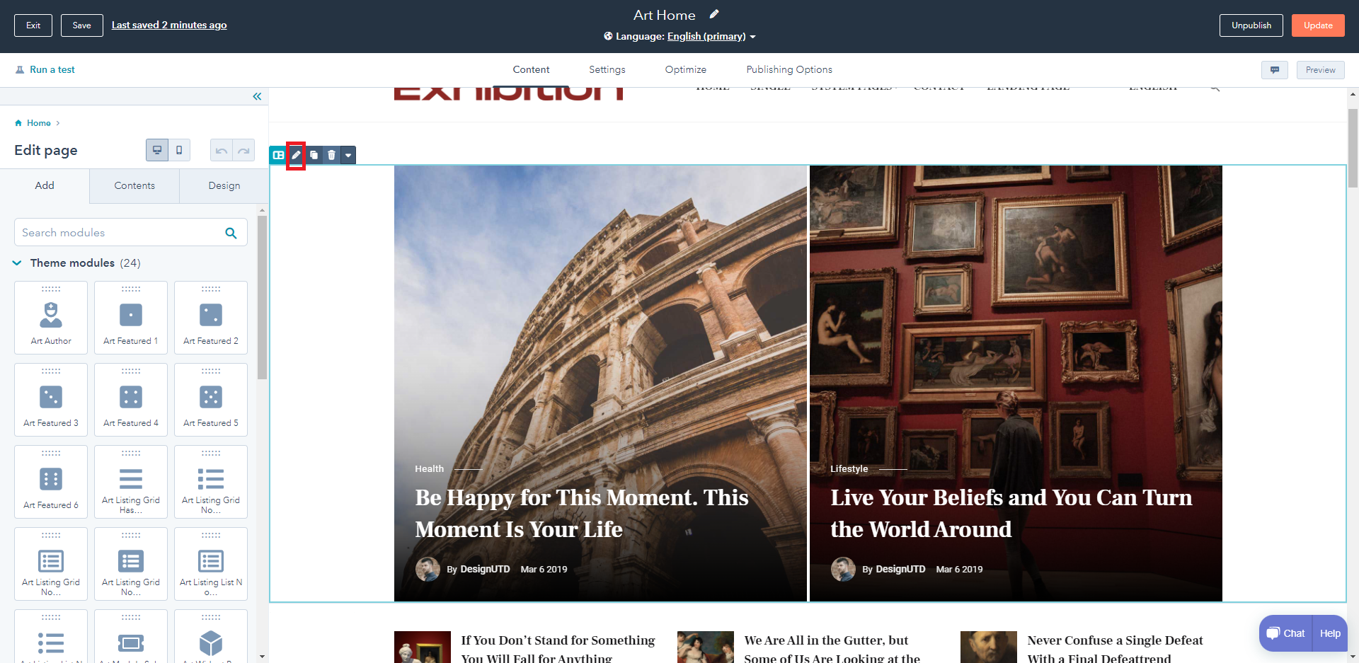 - To edit a module's contents, hover over the module and click the edit pencil icon.