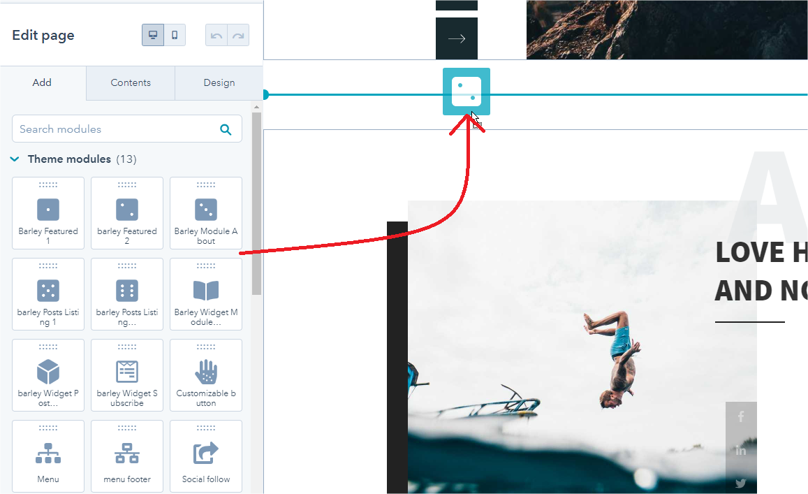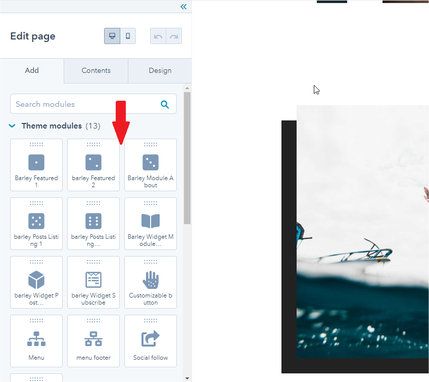 Note*: In the Contents tab on the left, you can view and edit all the modules in your page template. If your page contains global content, such as a page header, you'll edit this in your page within the global content editor.