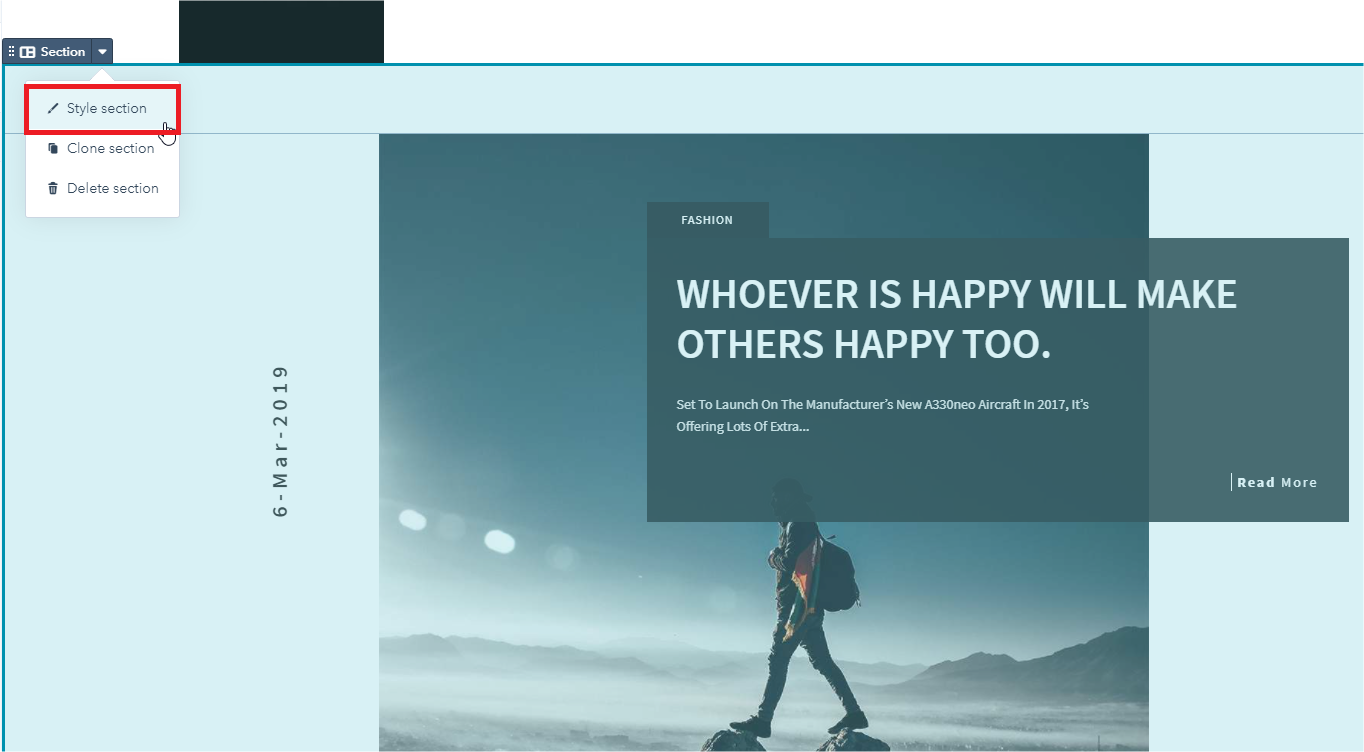 - After drag module move mouse to the section then click icon dropdown and choose Style section