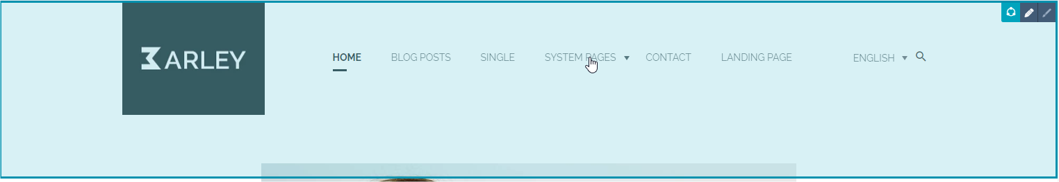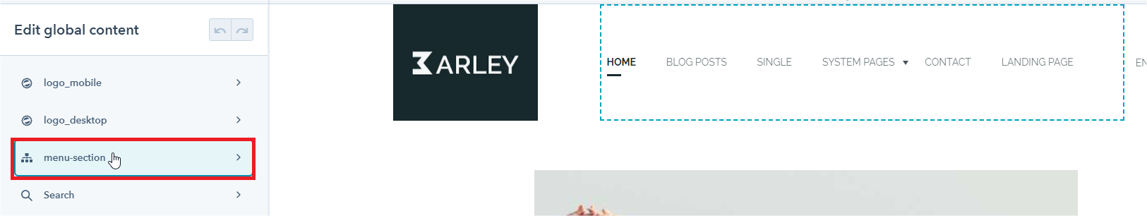 - From editor home page move the mouse to the header and footer of the home page then left click mouse and choose Open in global content editor.