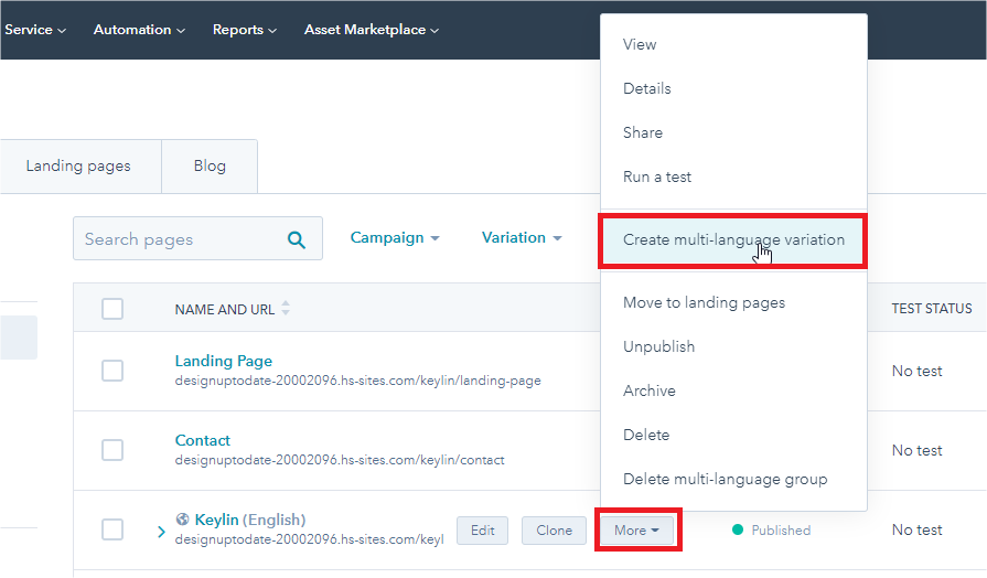 - In your HubSpot account, navigate to Marketing > Website > Landing Pages or Website Pages.