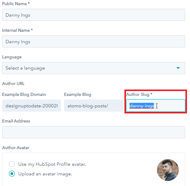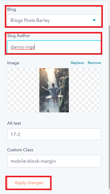 - Return to edit content page. Choose Blog then paste Author Slug in to field Author Slug