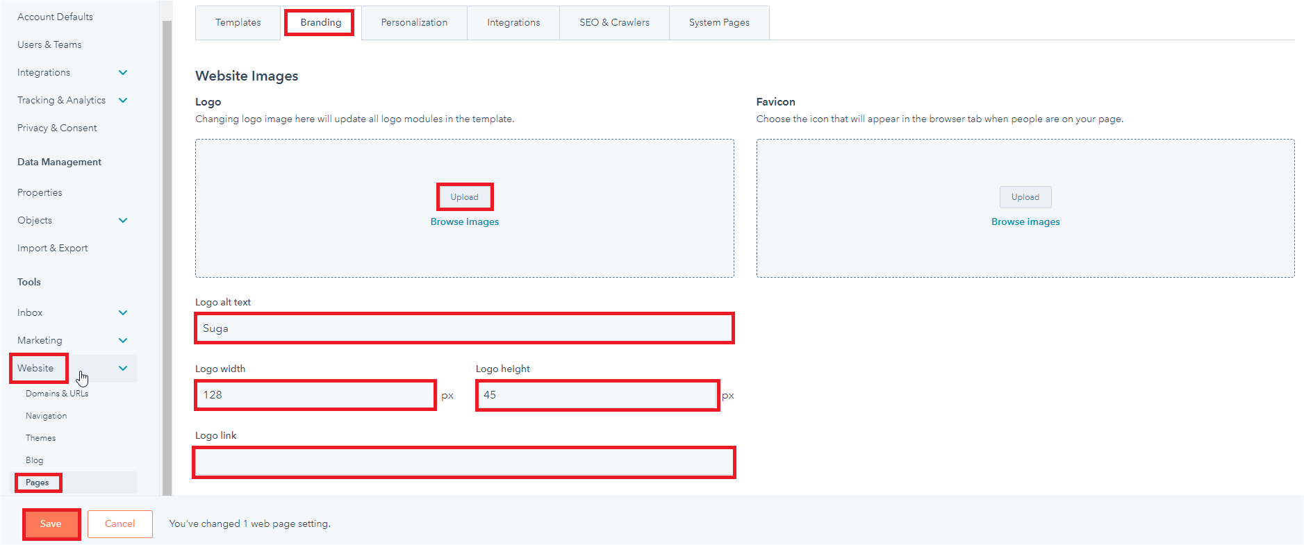 - In the left sidebar menu, navigate to Website > Pages > Navigate to the Branding tab.