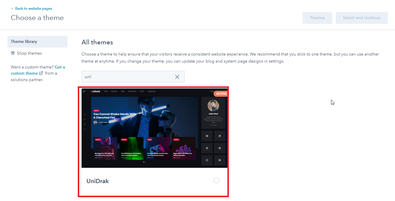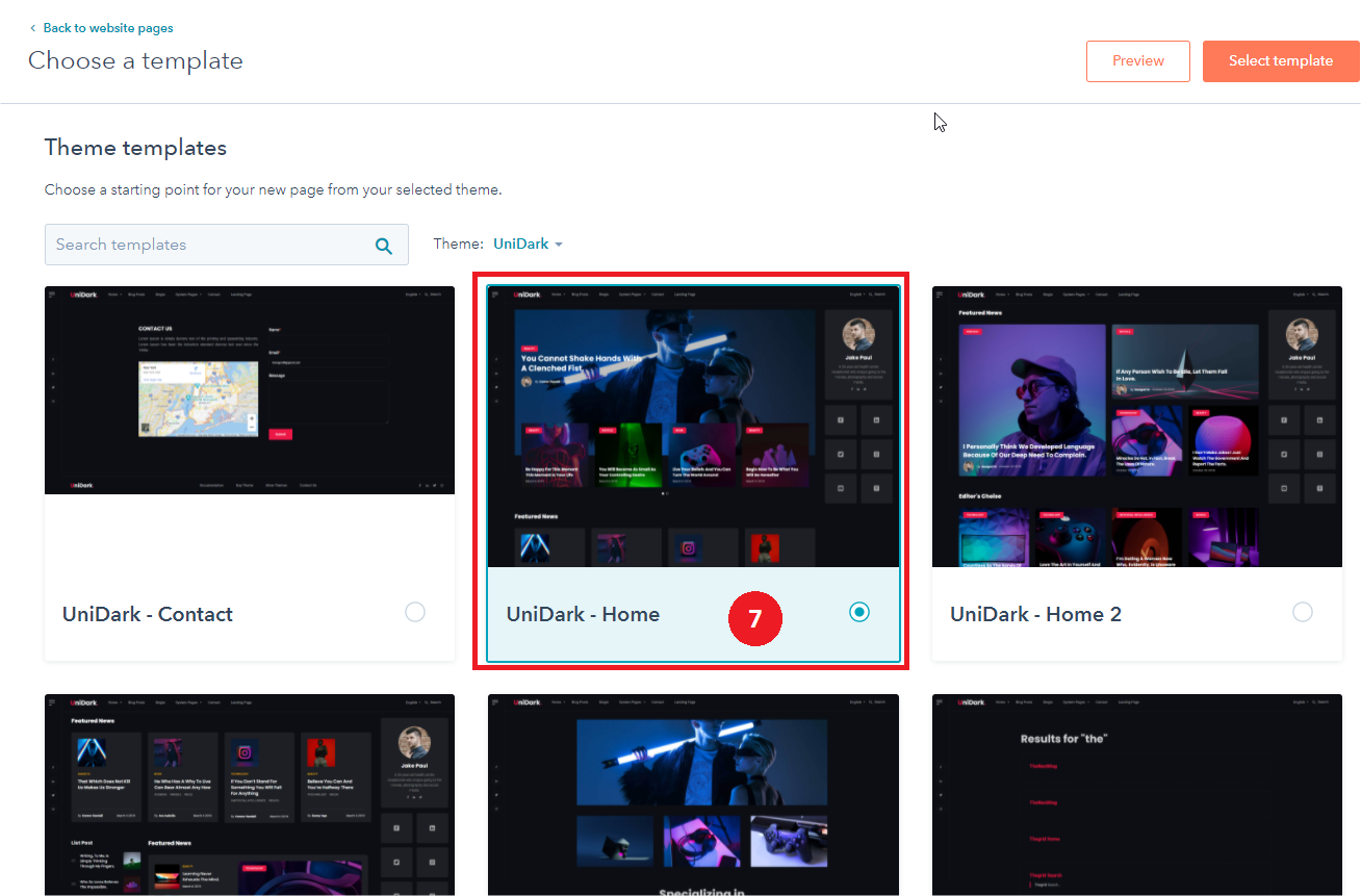 - Choose a template from your newly uploaded theme by selecting the CMS Theme Carbon.