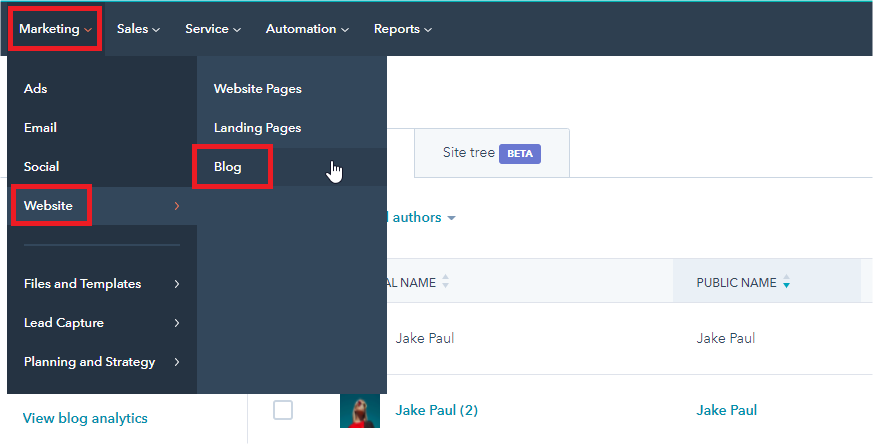 - In your HubSpot account, navigate to Marketing > Website> Blog.