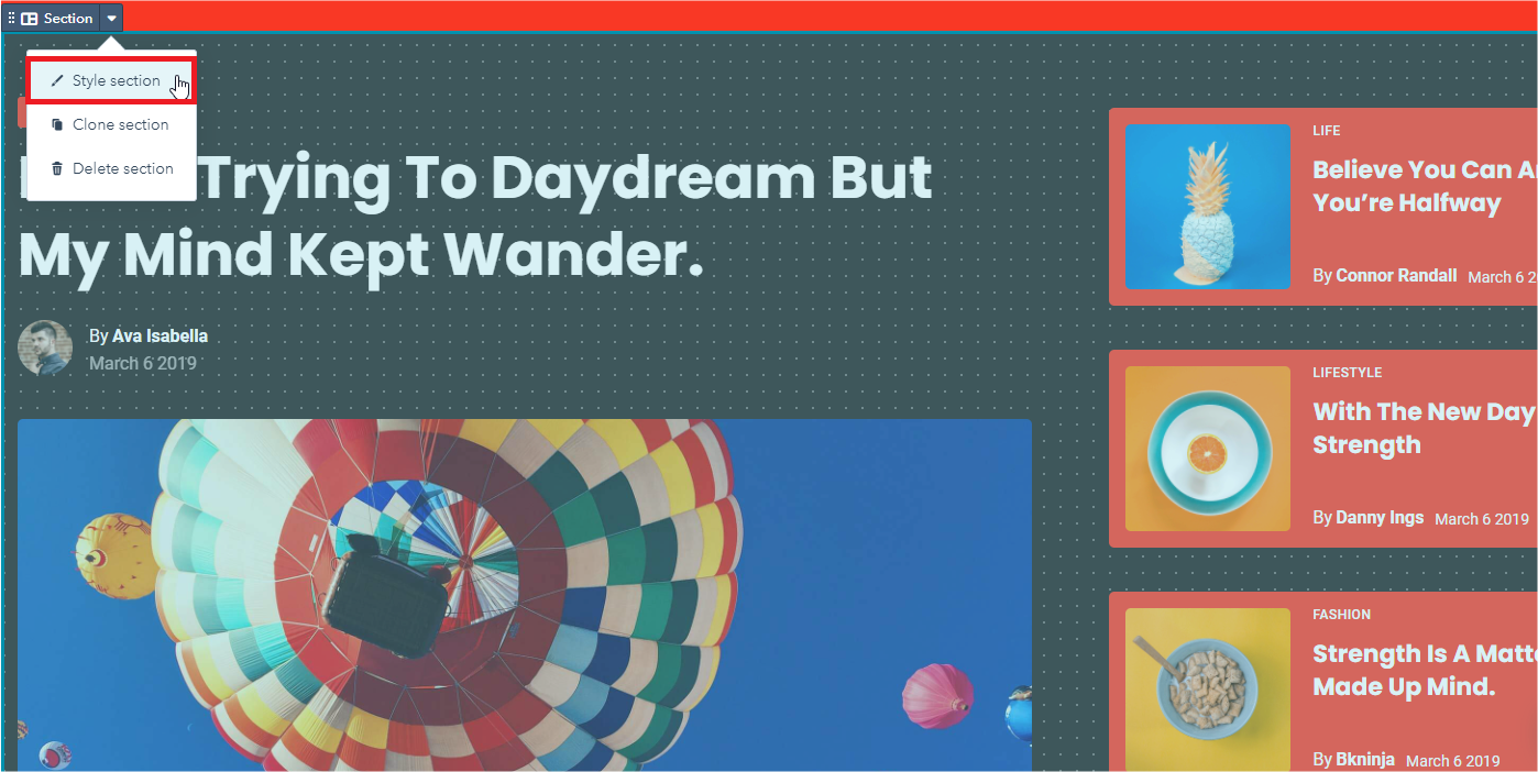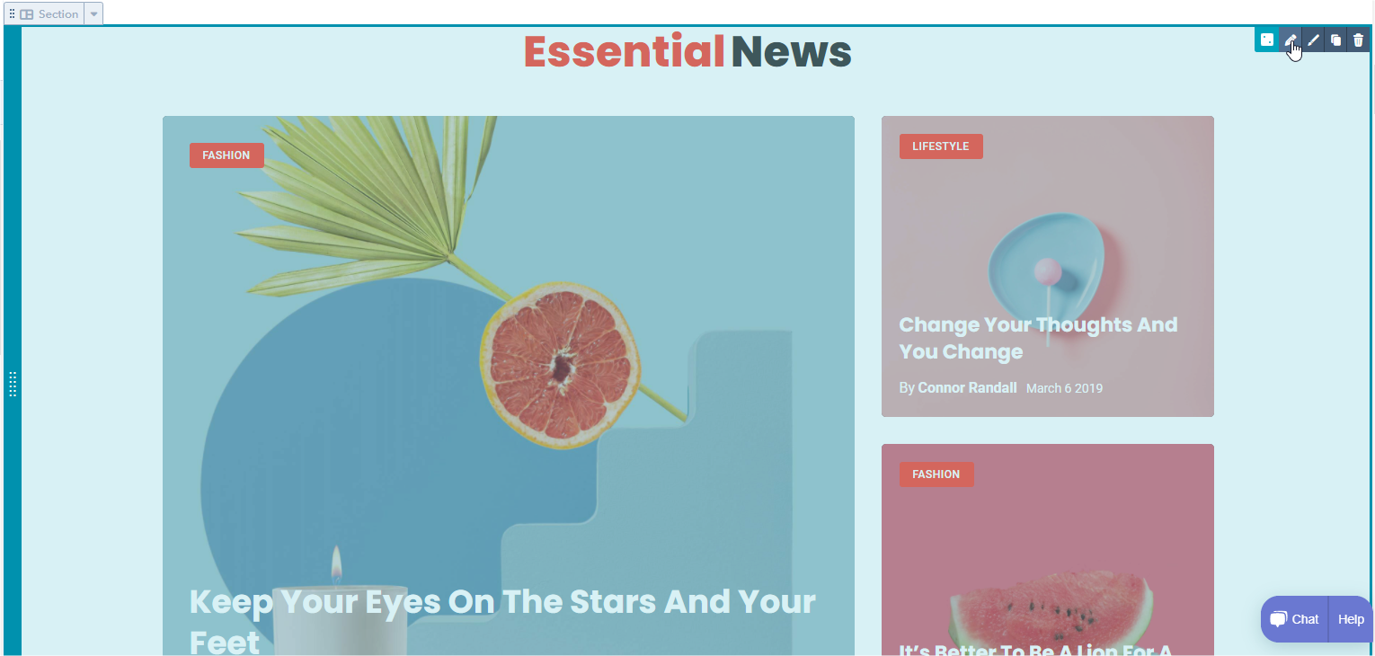 - After drag module move mouse to the section then click icon dropdown and choose Style section