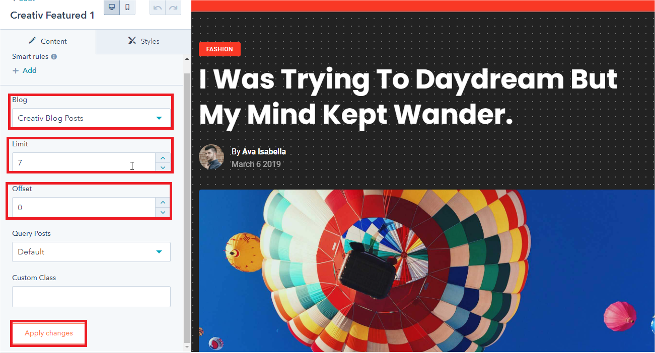 - Choose Module, in field Blog choose blog for module. Then in field Offset set offer for module. Click Apply changes.