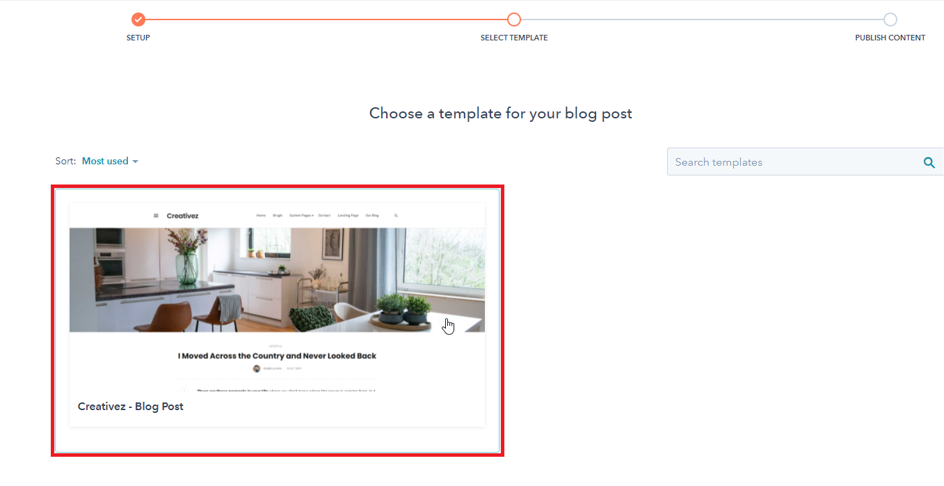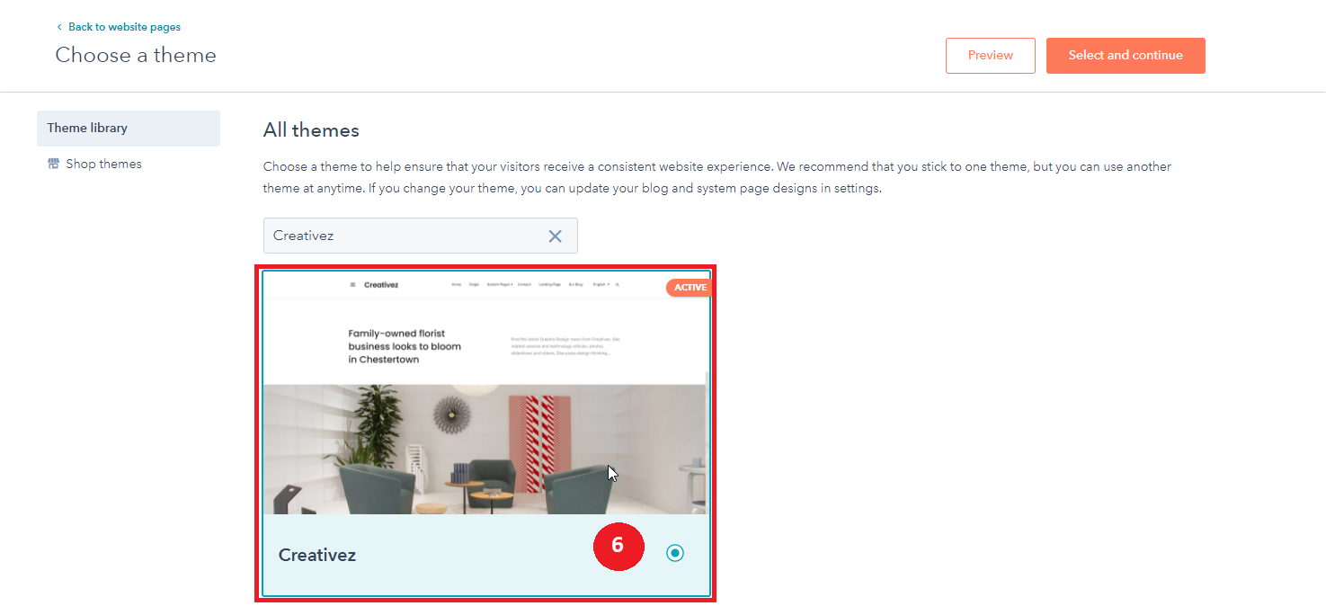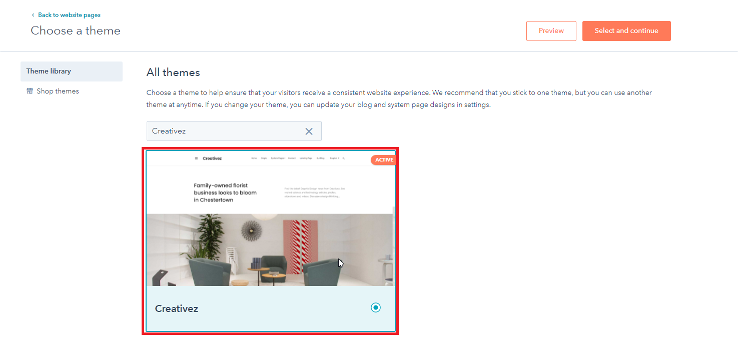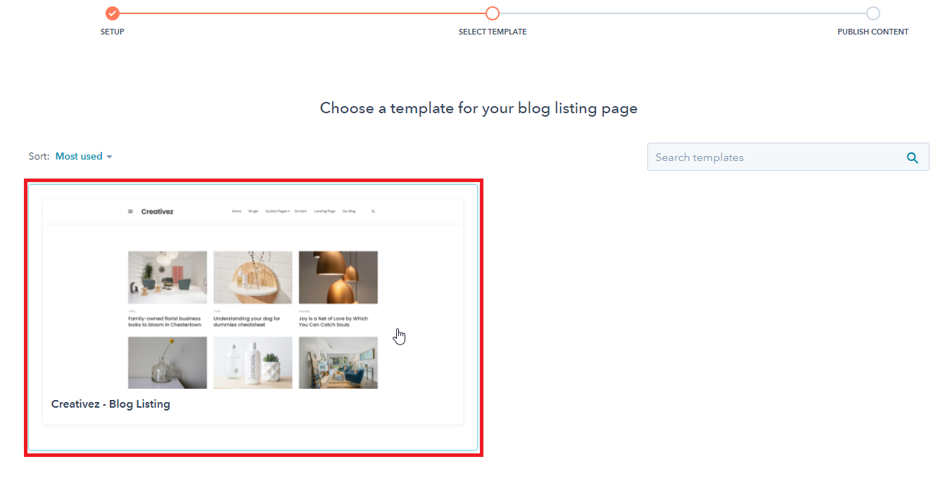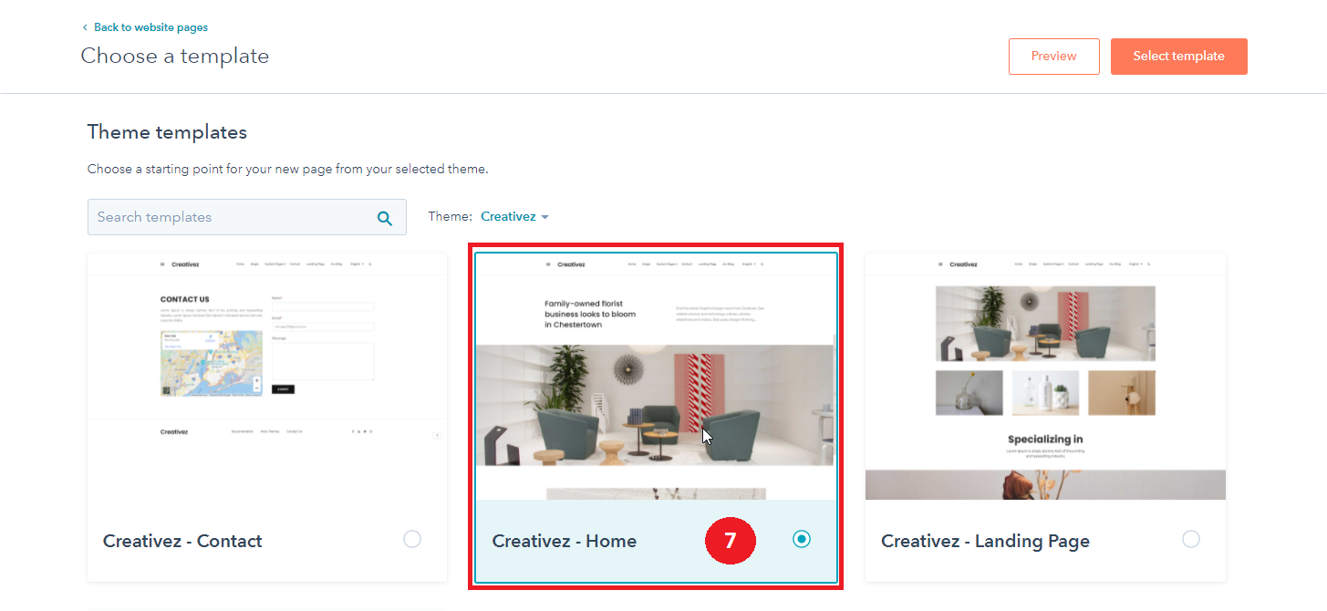 - Choose a template from your newly uploaded theme by selecting the CMS Theme Creativez.