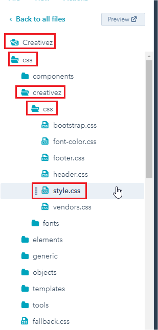 - In left sidebar, choose Creativez > css > Creativez > css > style.css .