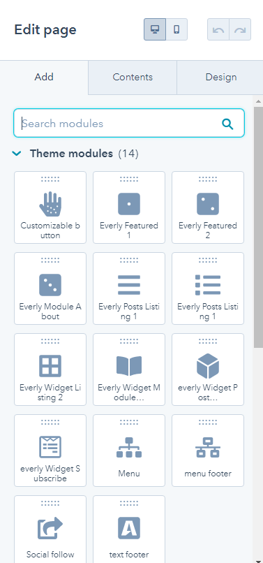 - After create page, drag and drop modules to contnet page.