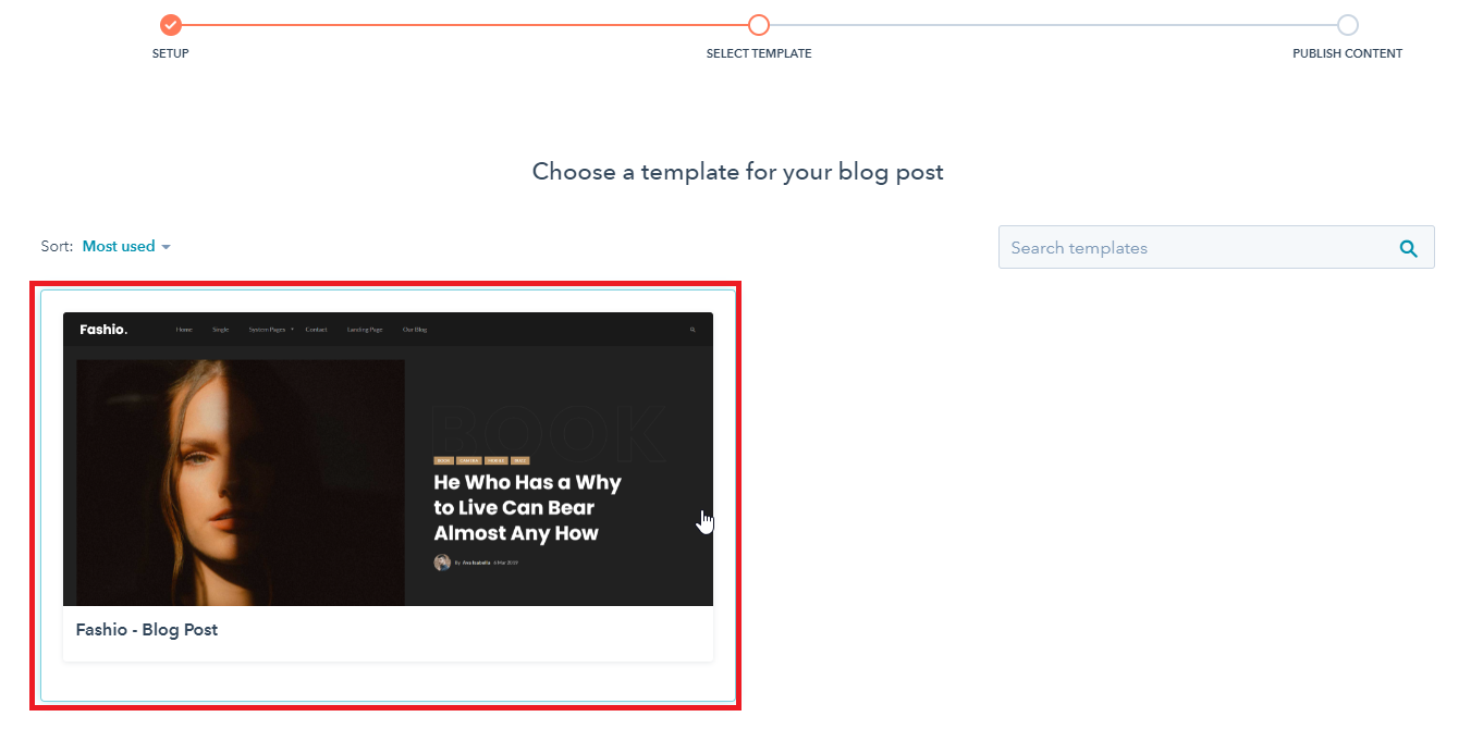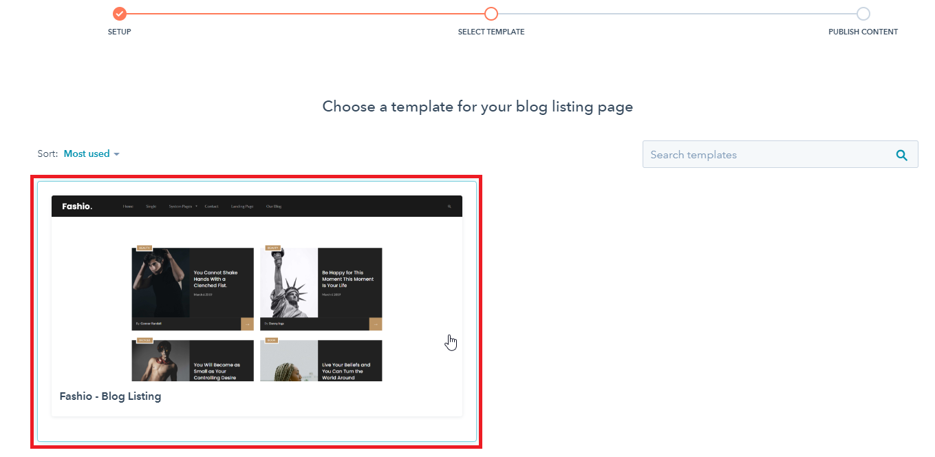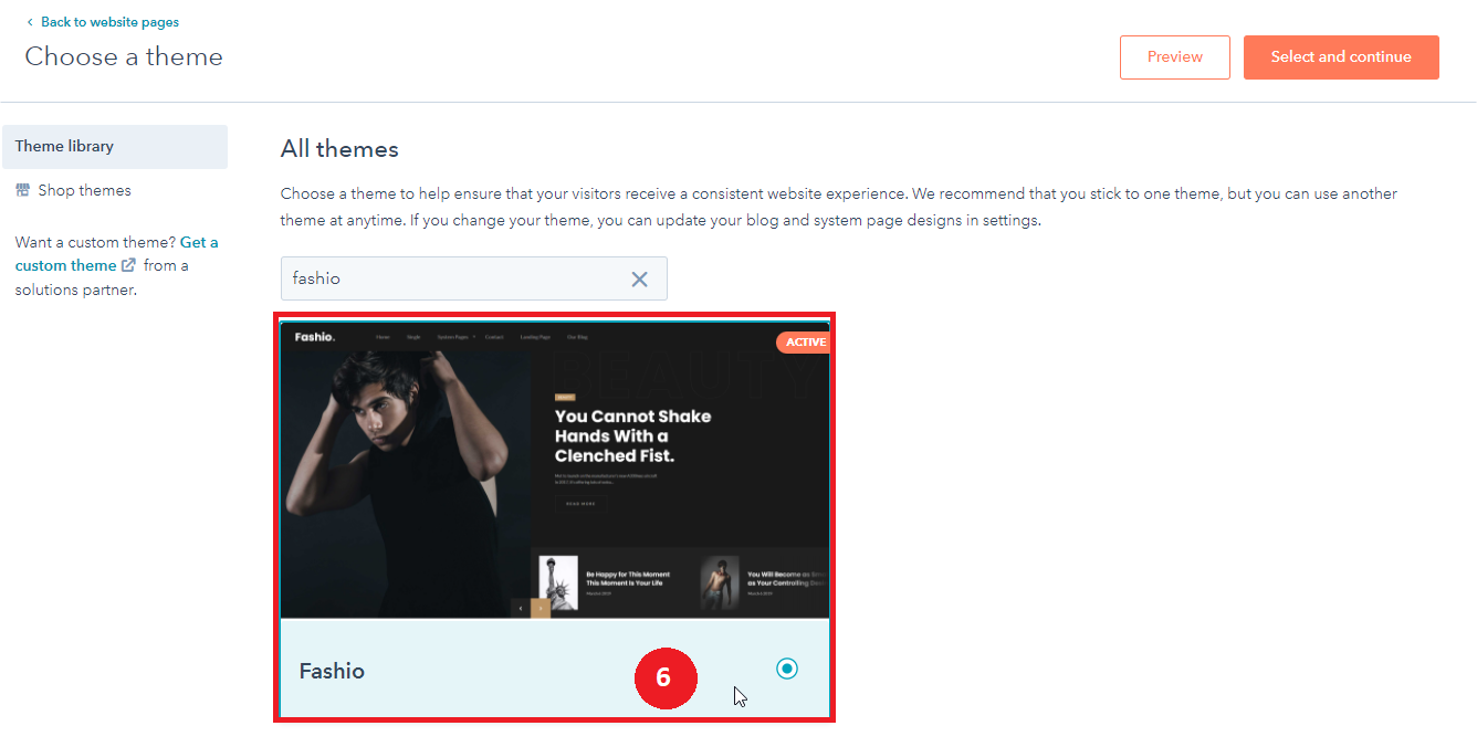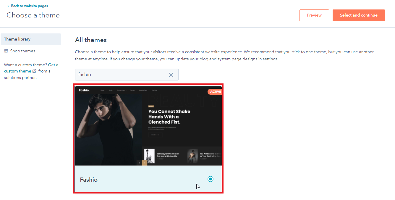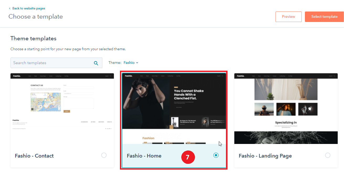 - Choose a template from your newly uploaded theme by selecting the CMS Theme fashio.
