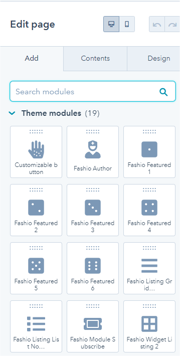 Note*: In the Contents tab on the left, you can view and edit all the modules in your page template. If your page contains global content, such as a page header, you'll edit this in your page within the global content editor.