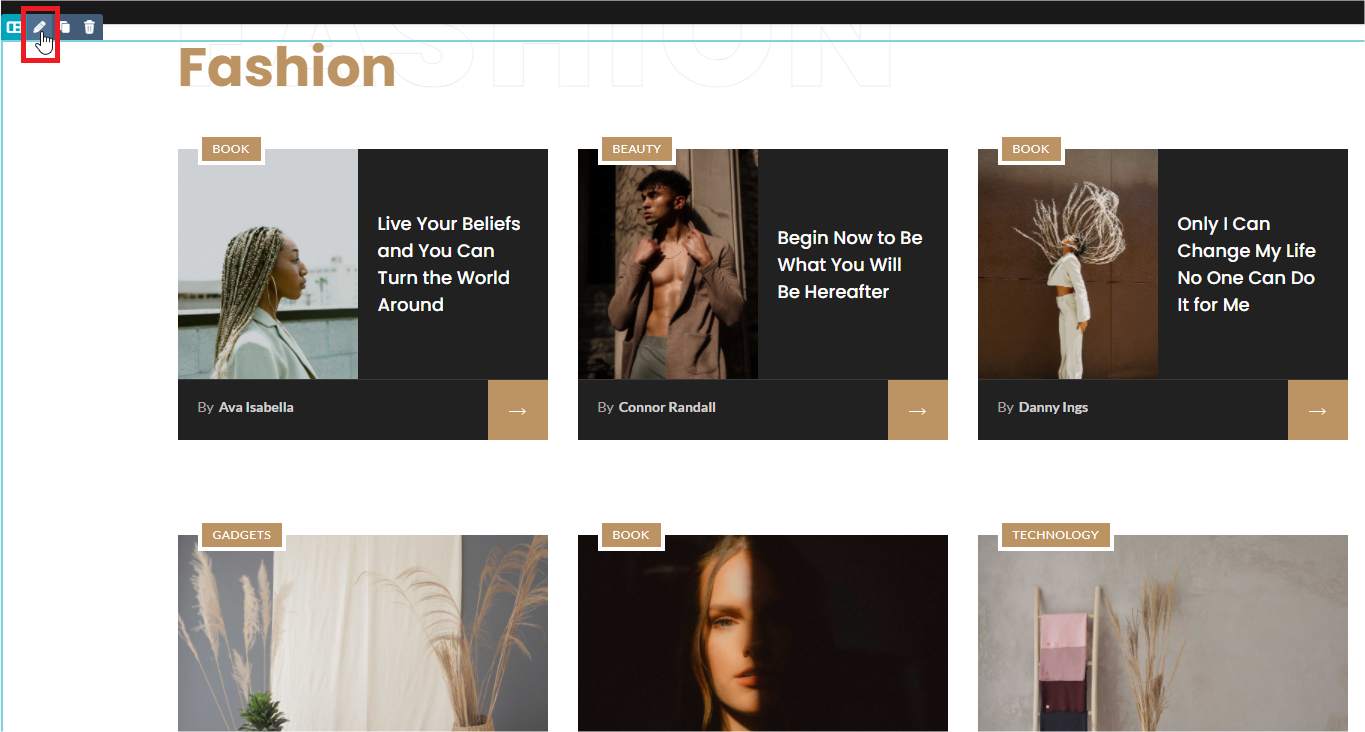 - To edit a module's contents, hover over the module and click the edit pencil icon.