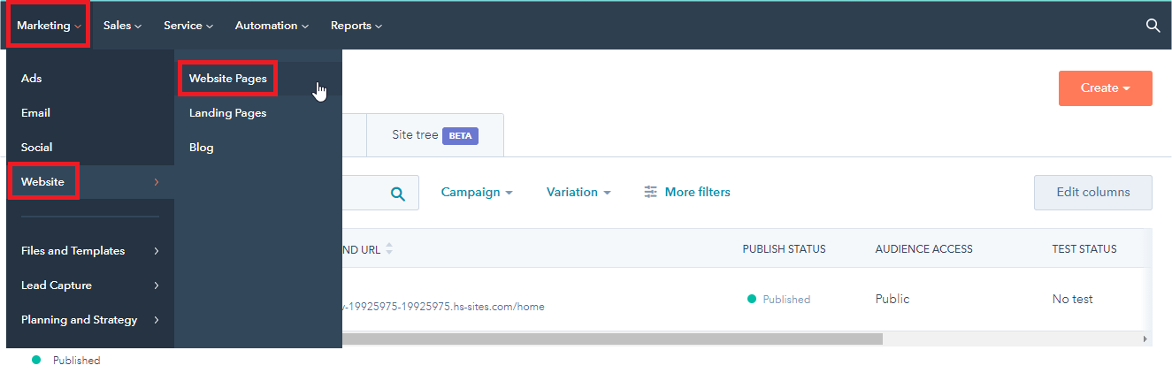 - In HubSpot, navigate to Marketing > website > website Pages.