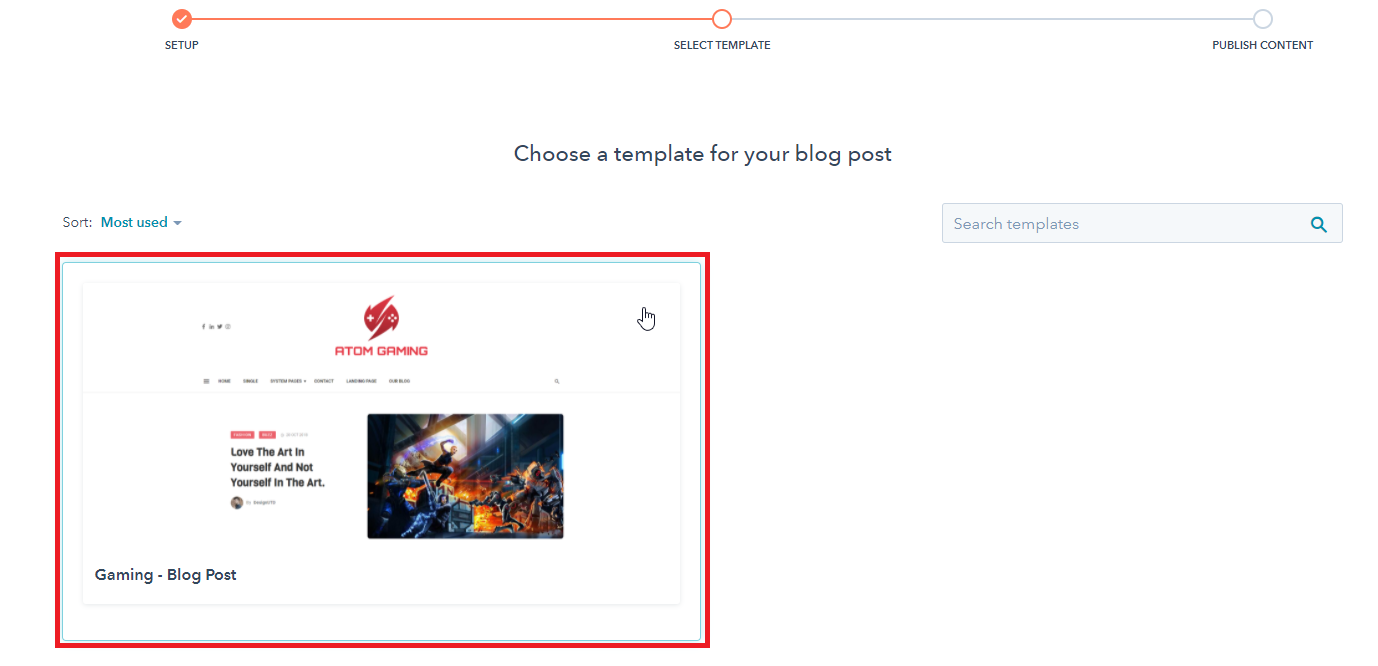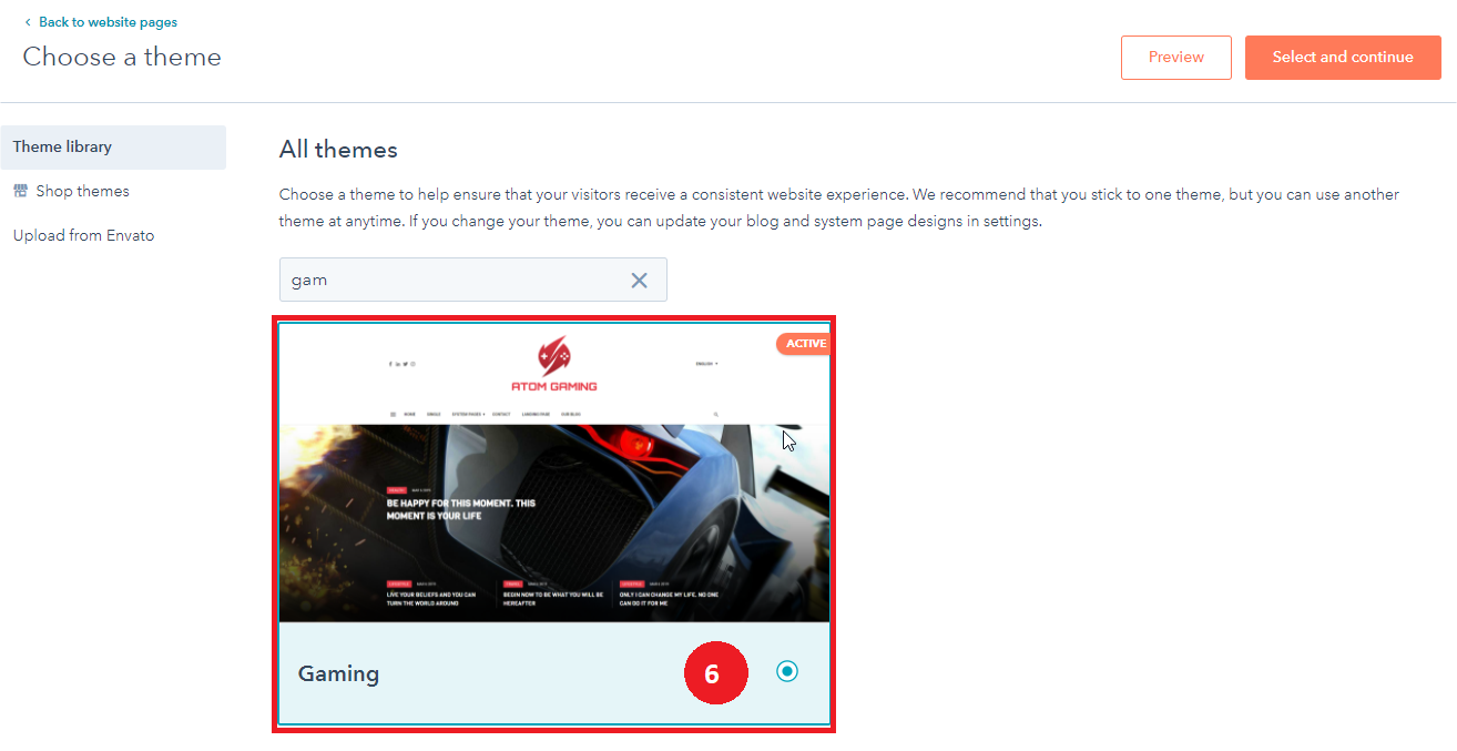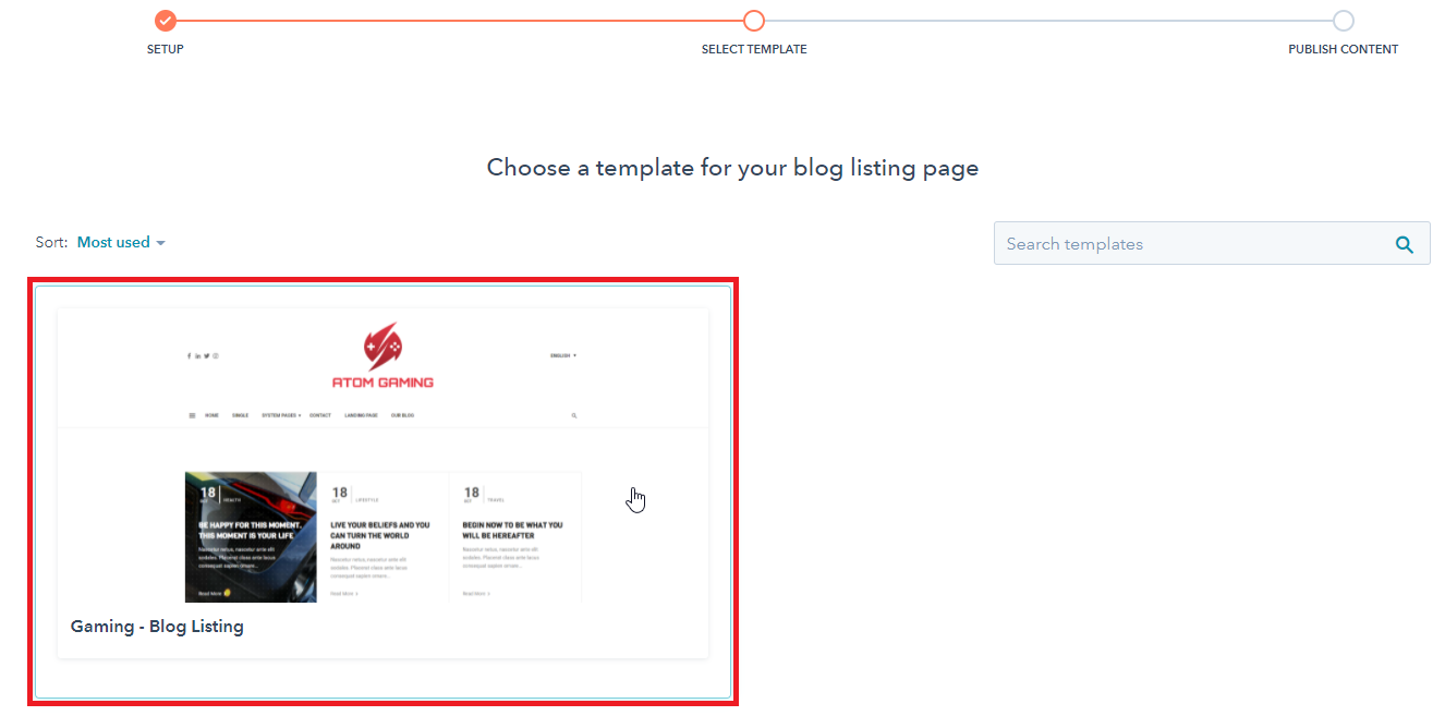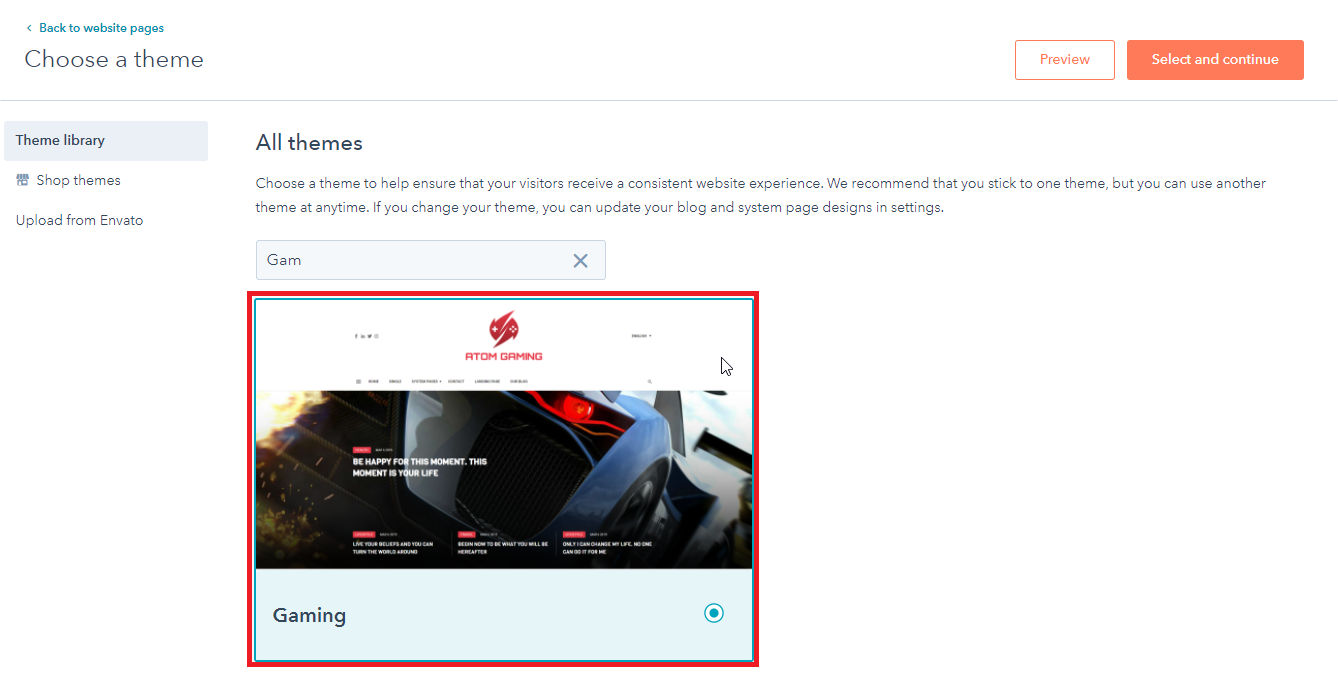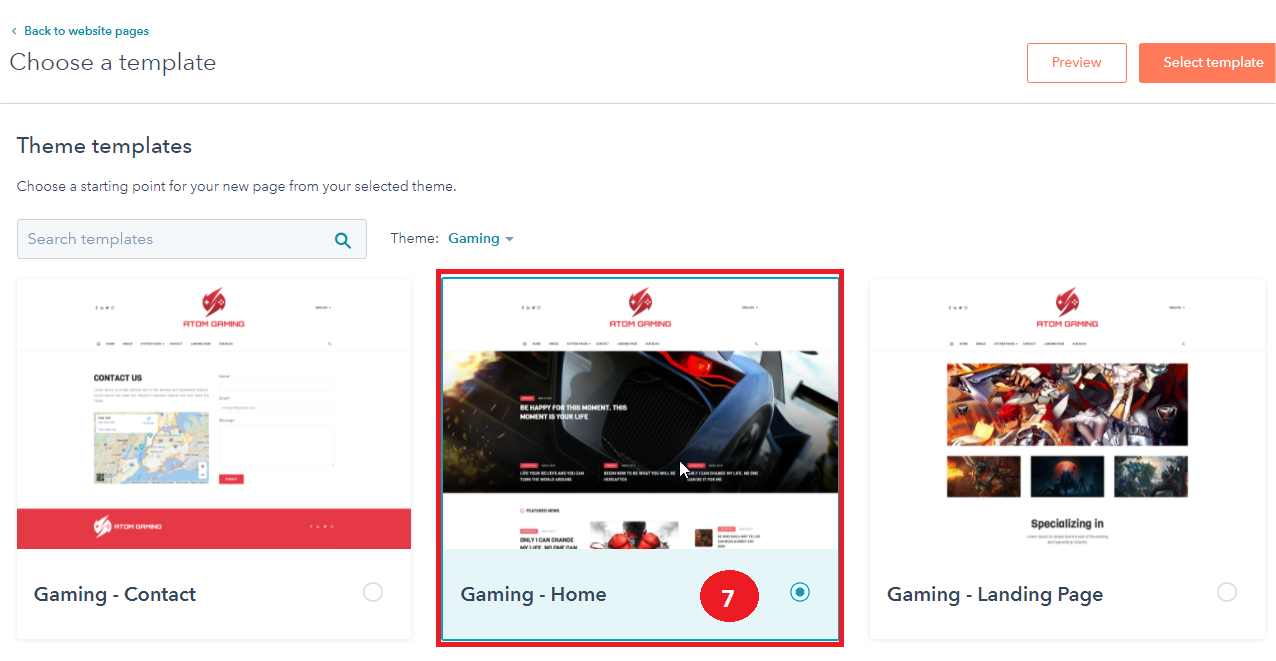 - Choose a template from your newly uploaded theme by selecting the CMS Theme Gaming.