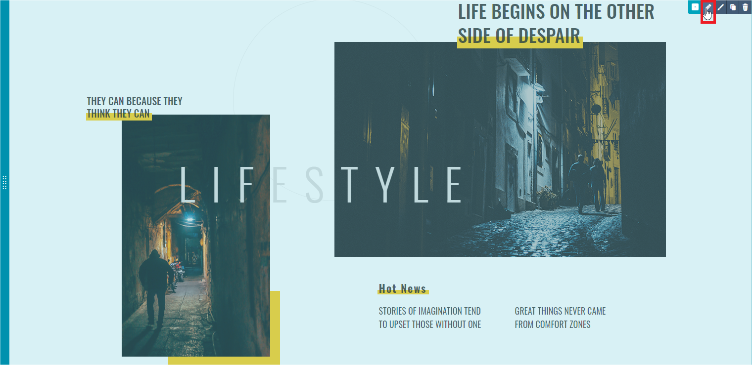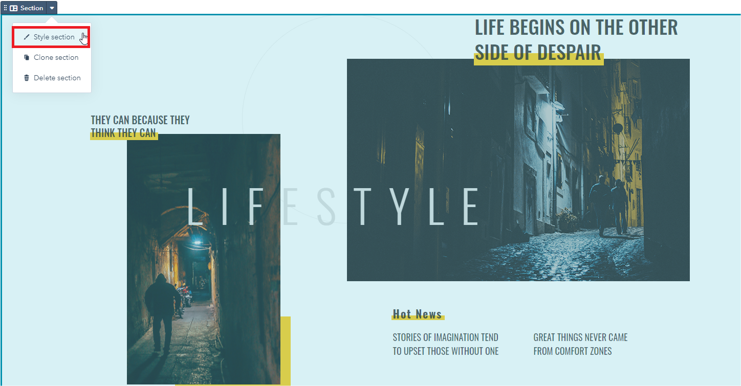 - After drag module move mouse to the section then click icon dropdown and choose Style section