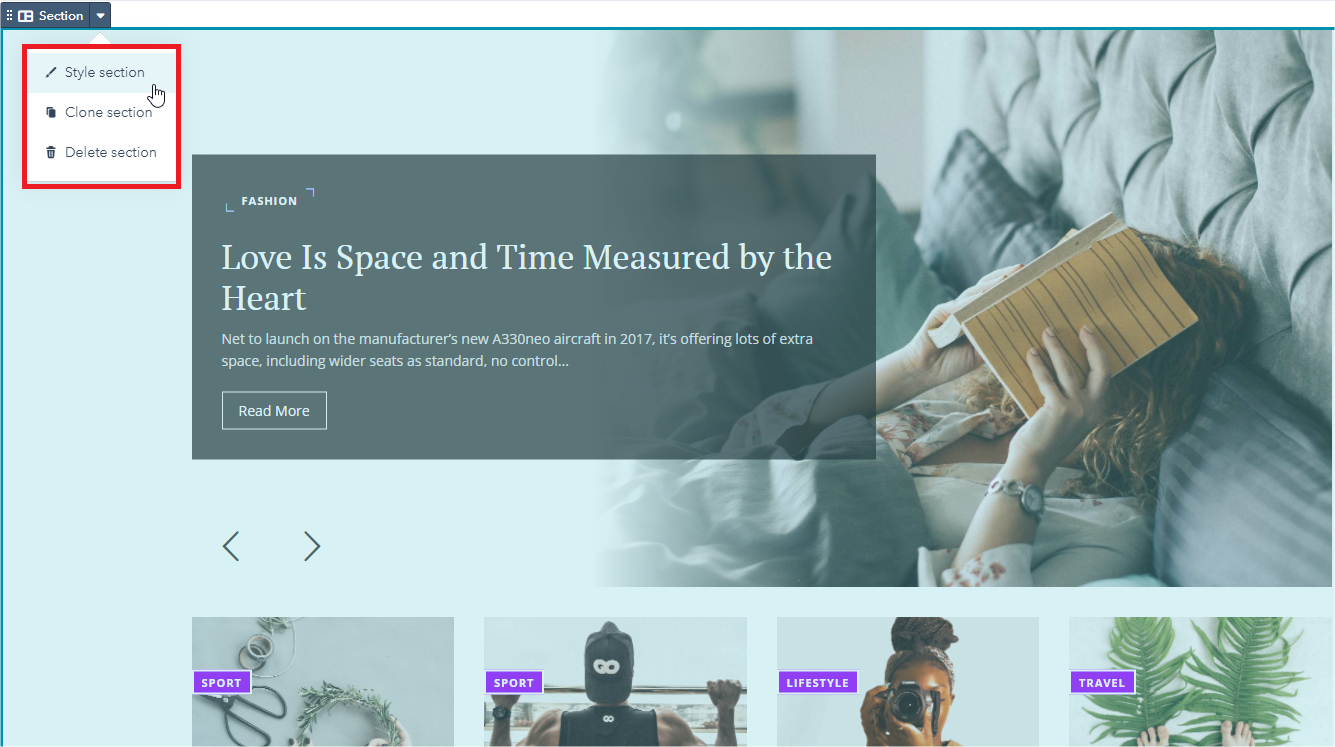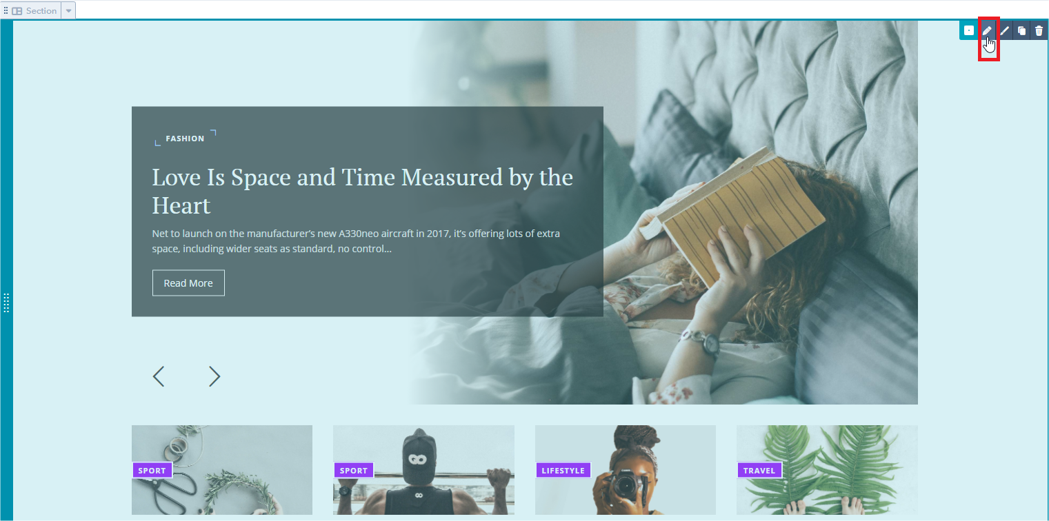 - After drag module move mouse to the section then click icon dropdown and choose Style section