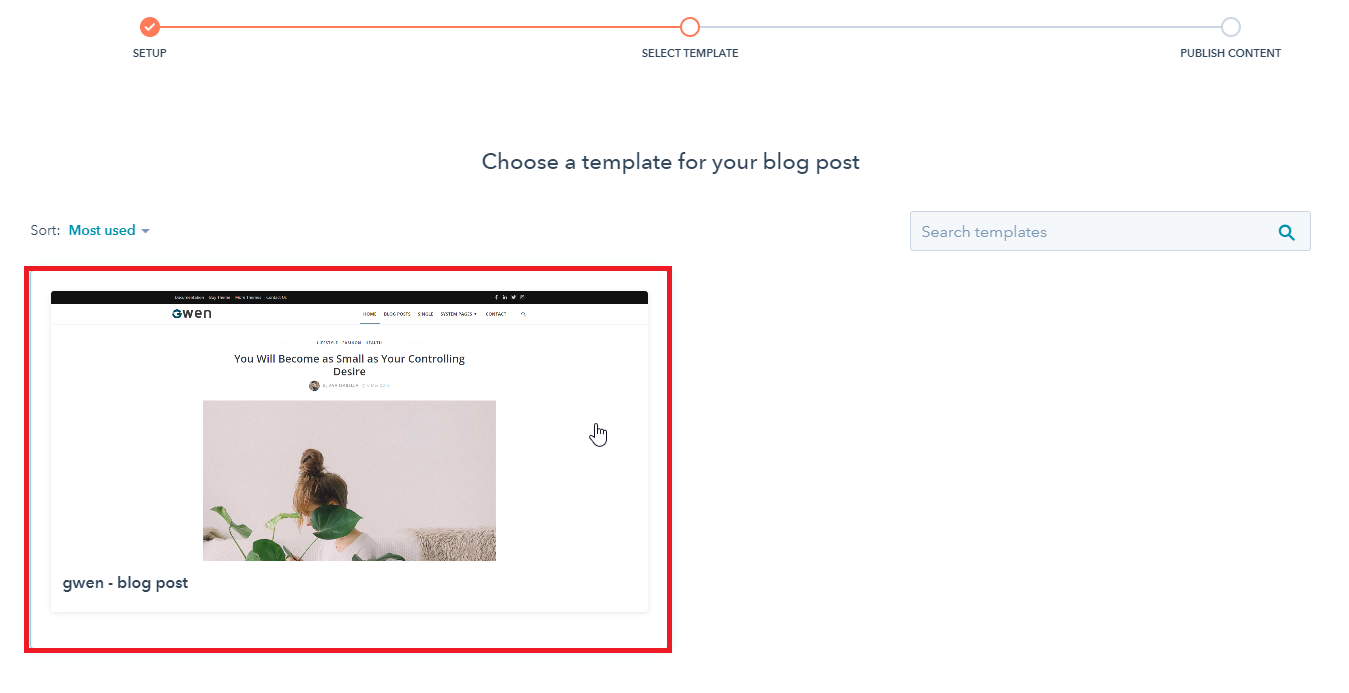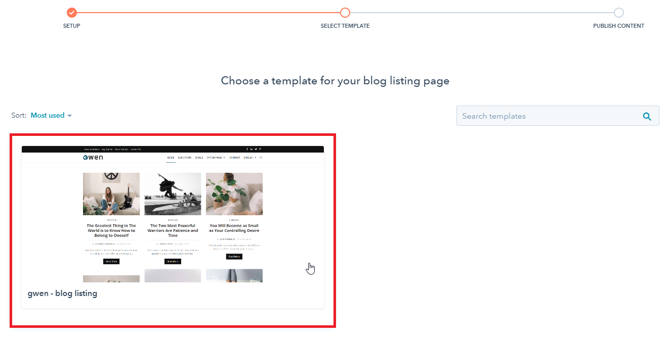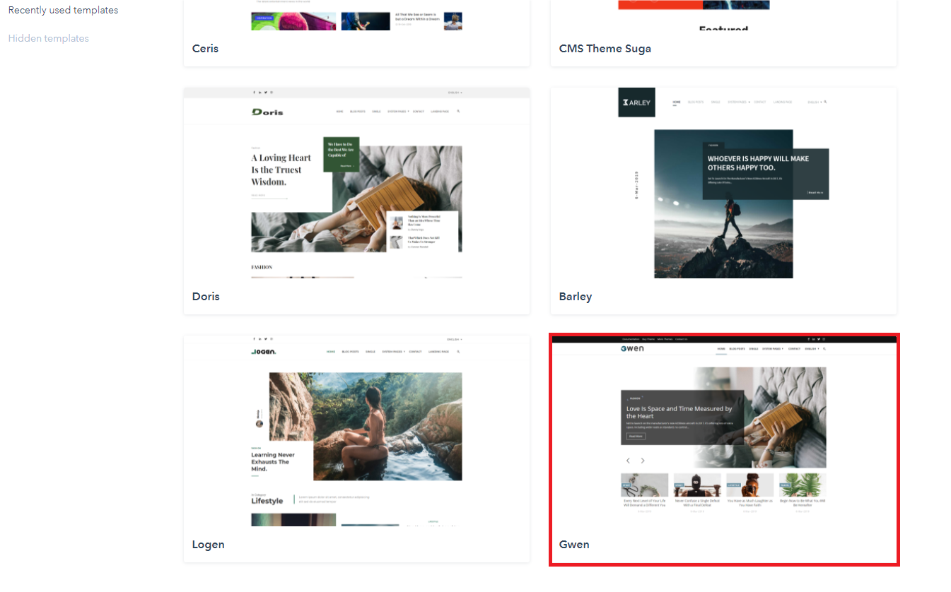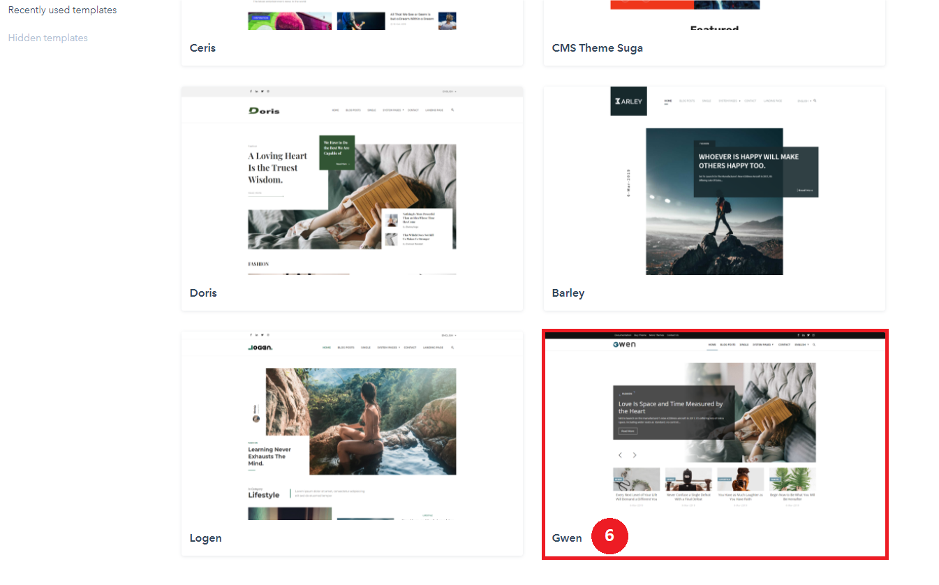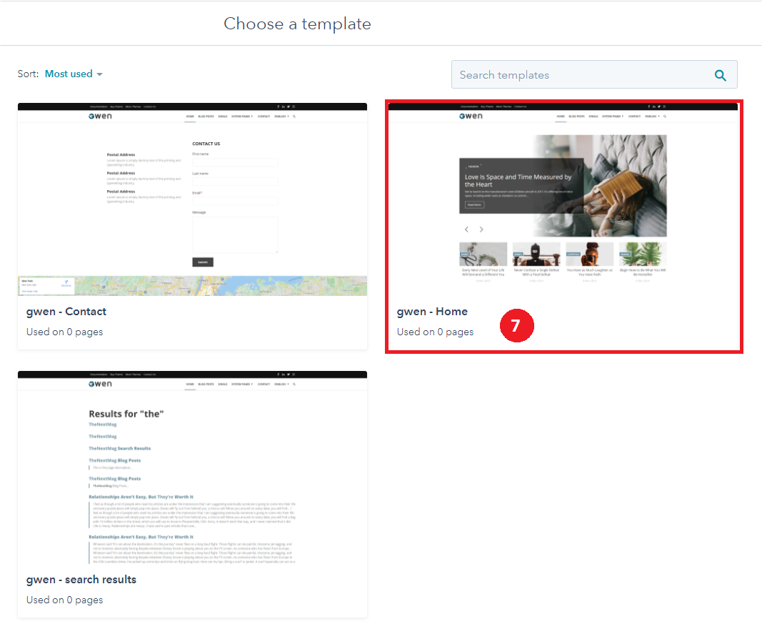 - Choose a template from your newly uploaded theme by selecting the CMS Theme Gwen.