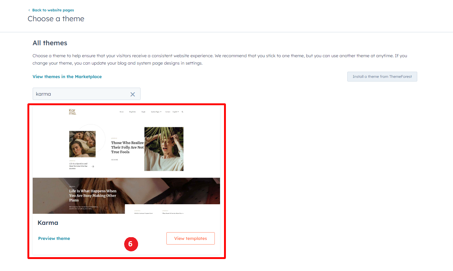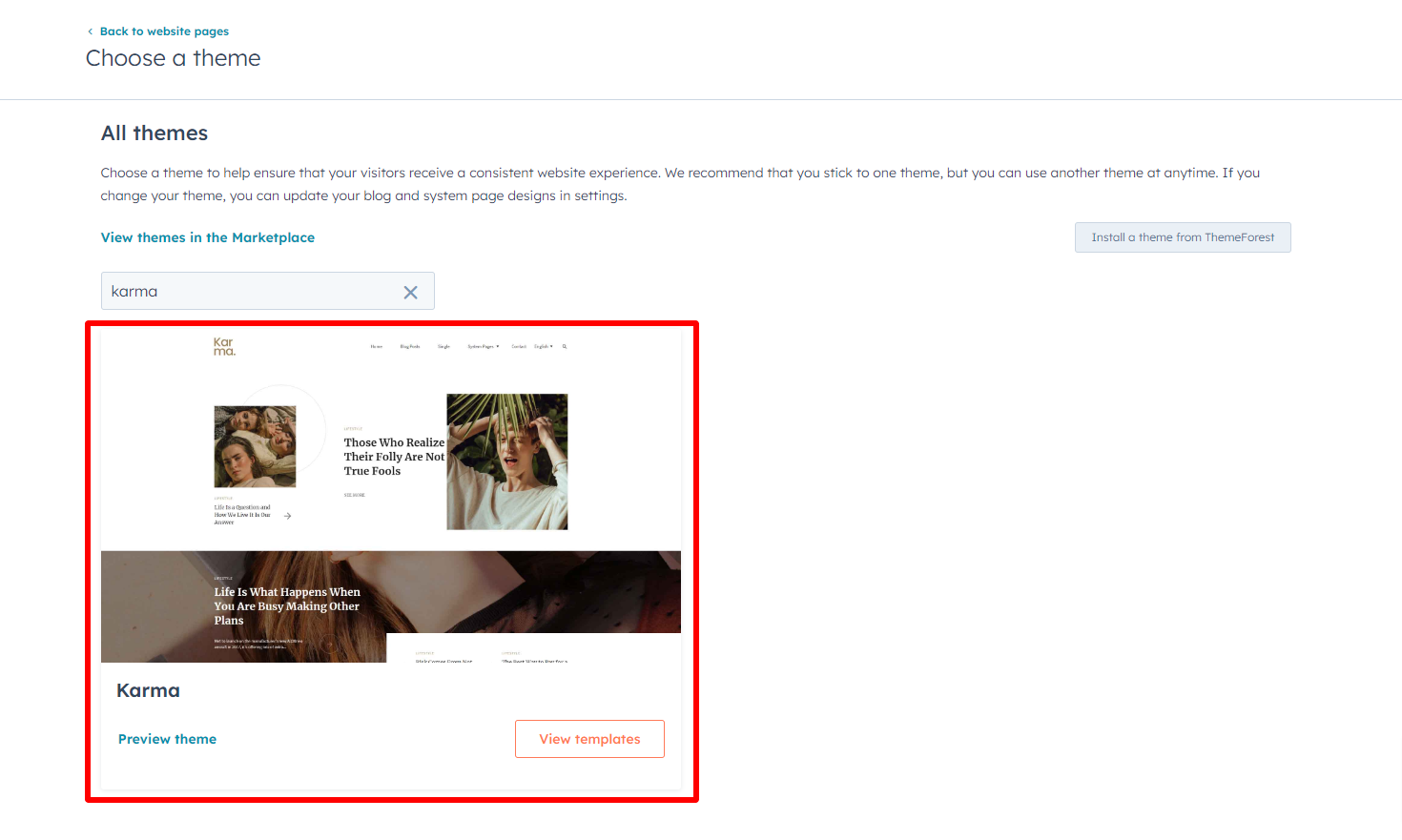 - In your HubSpot account, click the Marketplace > Asset Marketplace choose the theme Karma