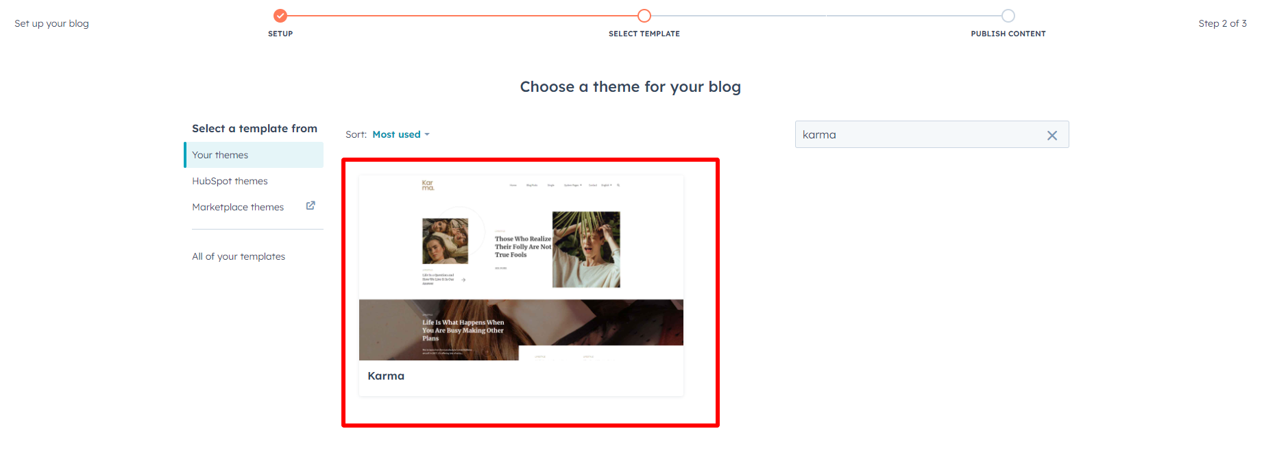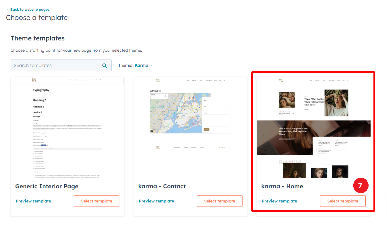 - Choose a template from your newly uploaded theme by selecting the CMS Theme Karma.