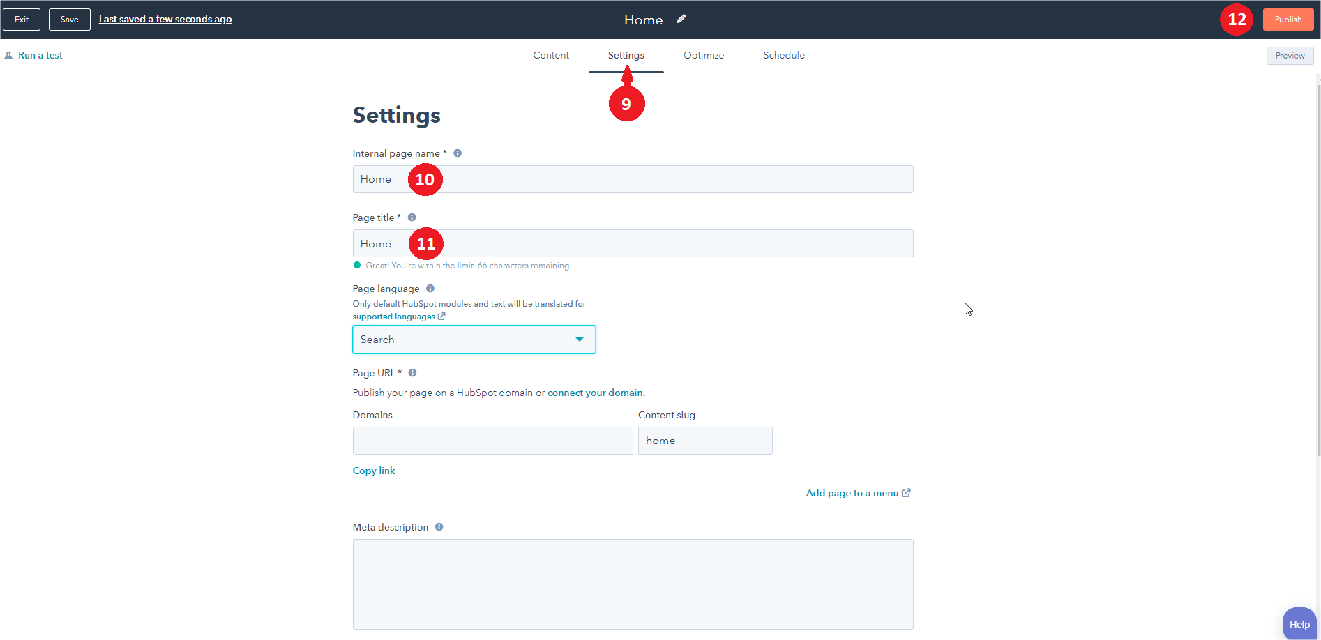 - To edit your page settings and add some basic page information, click the Settings tab at the top of the page editor.