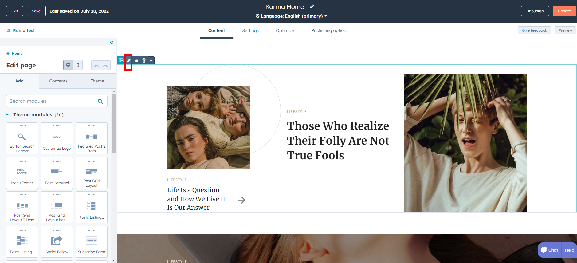 - To edit a module's contents, hover over the module and click the edit pencil icon.