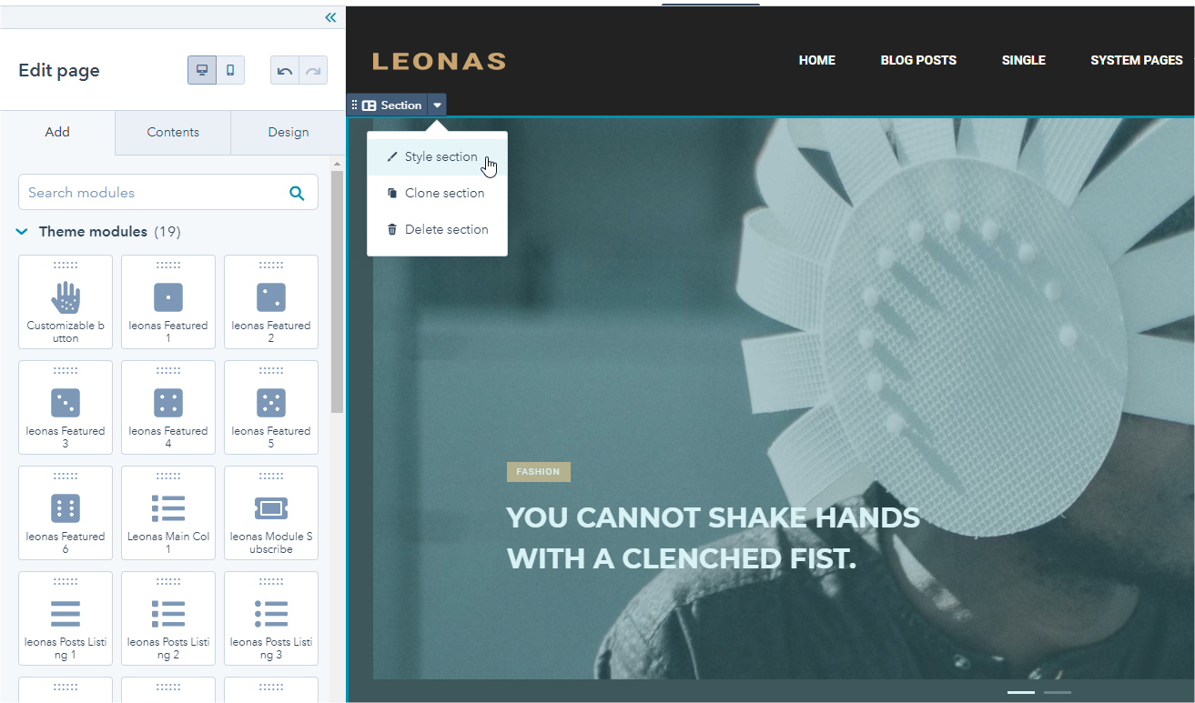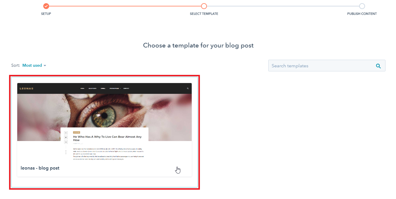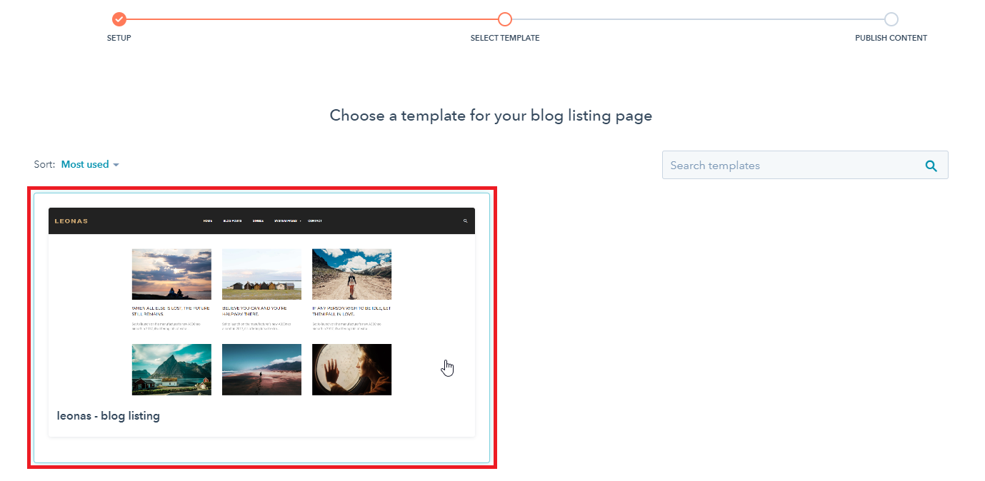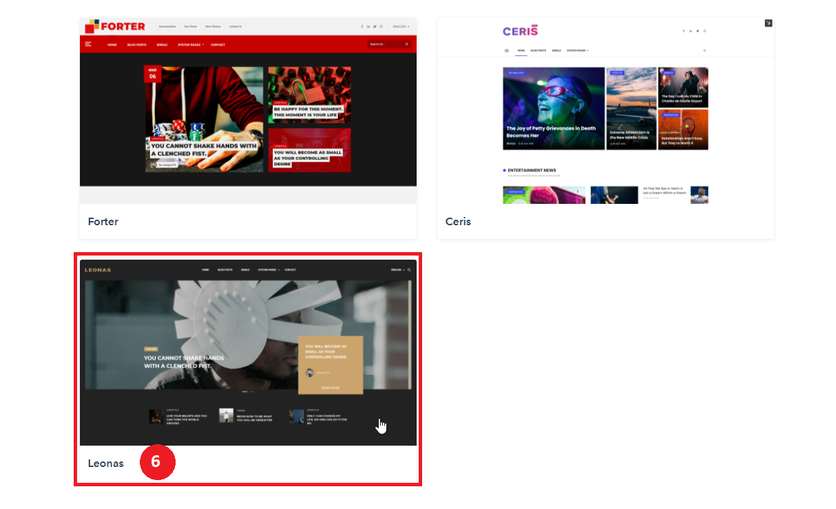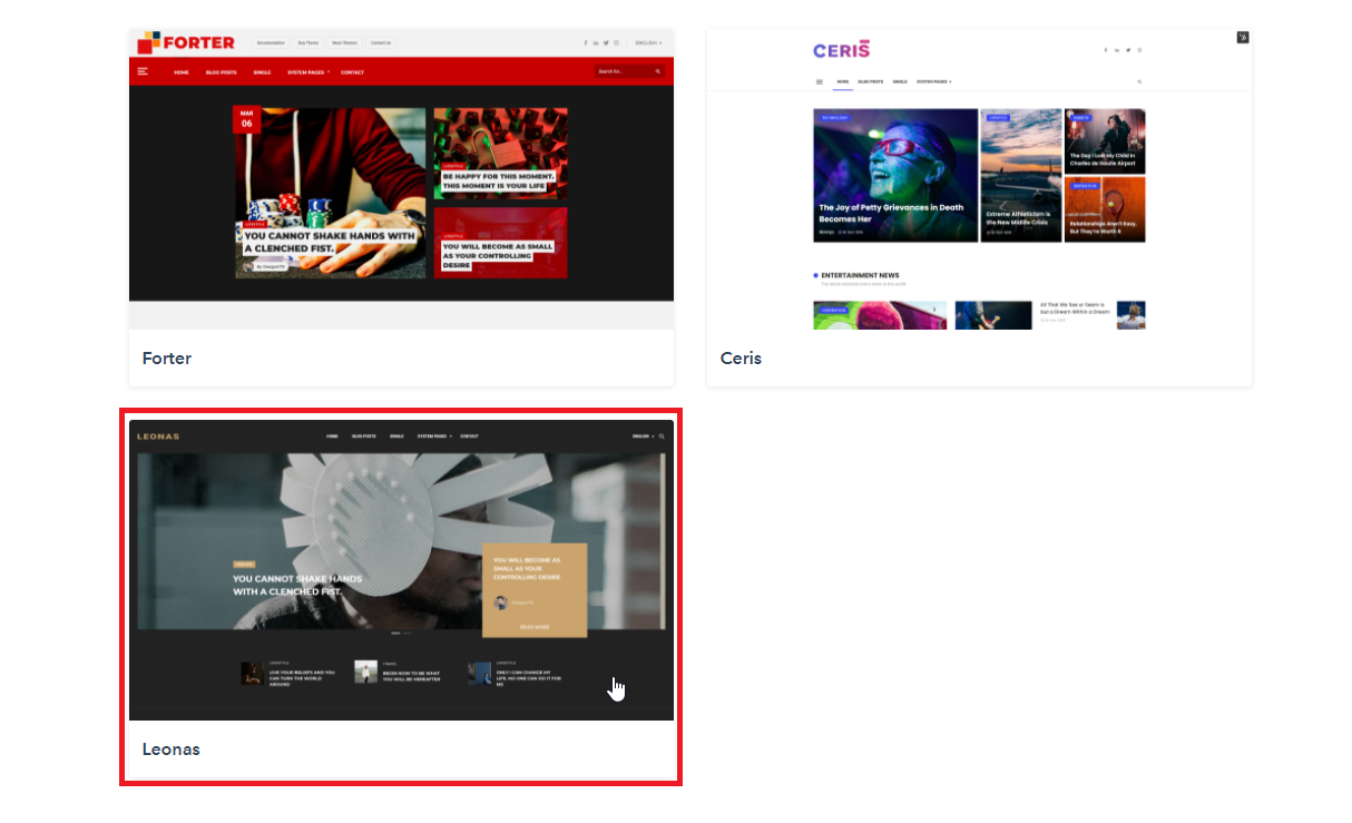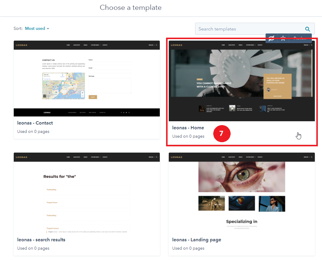 - Choose a template from your newly uploaded theme by selecting the CMS Theme leonas.