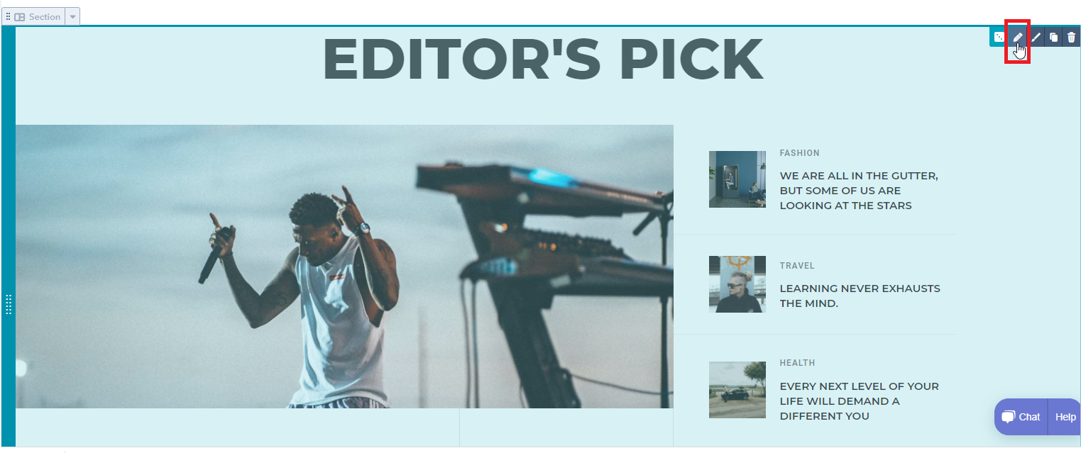 - After drag module move mouse to the section then click icon dropdown and choose Style section