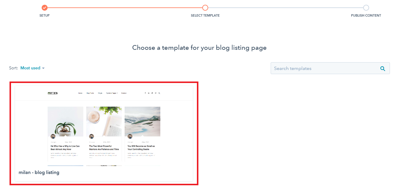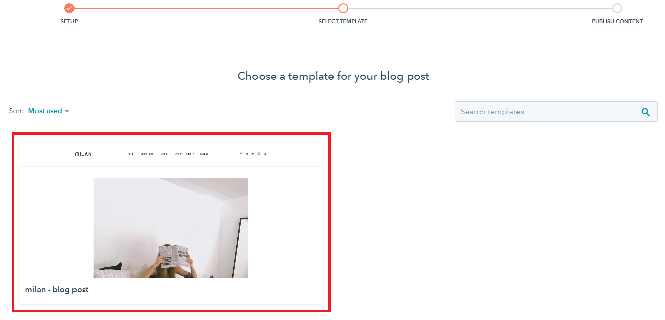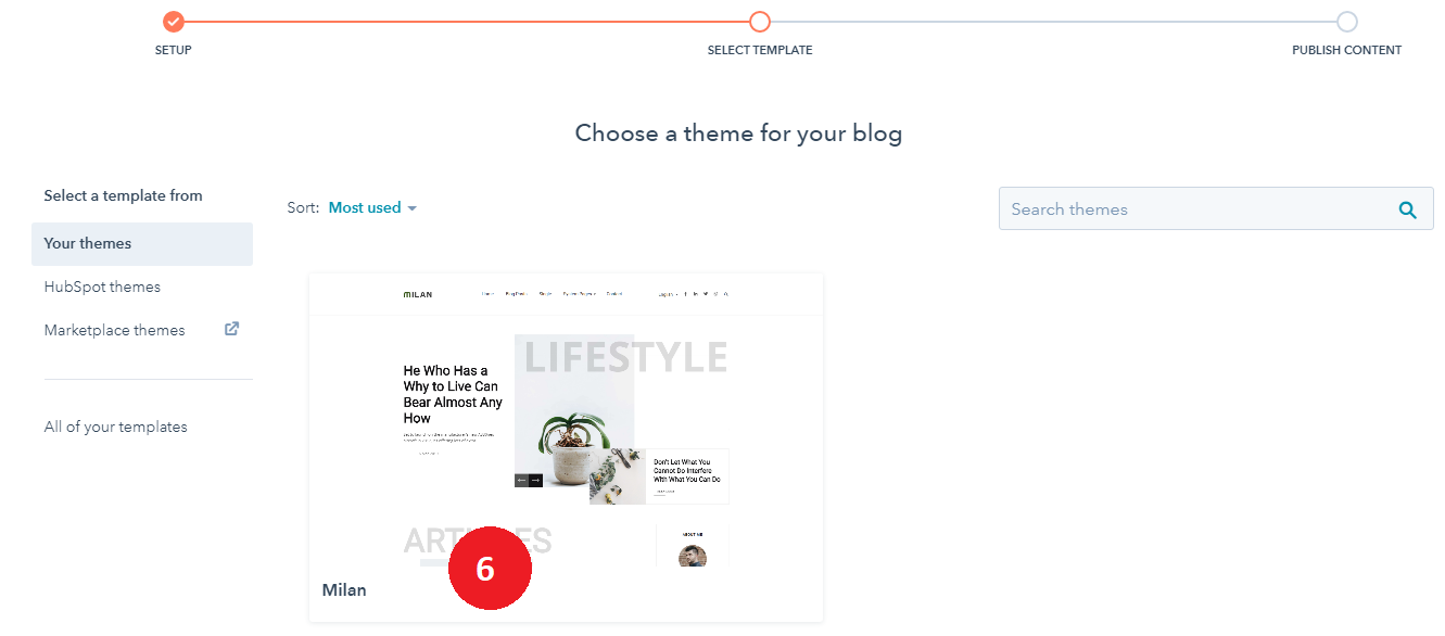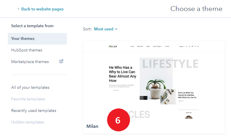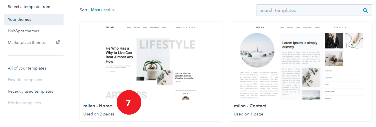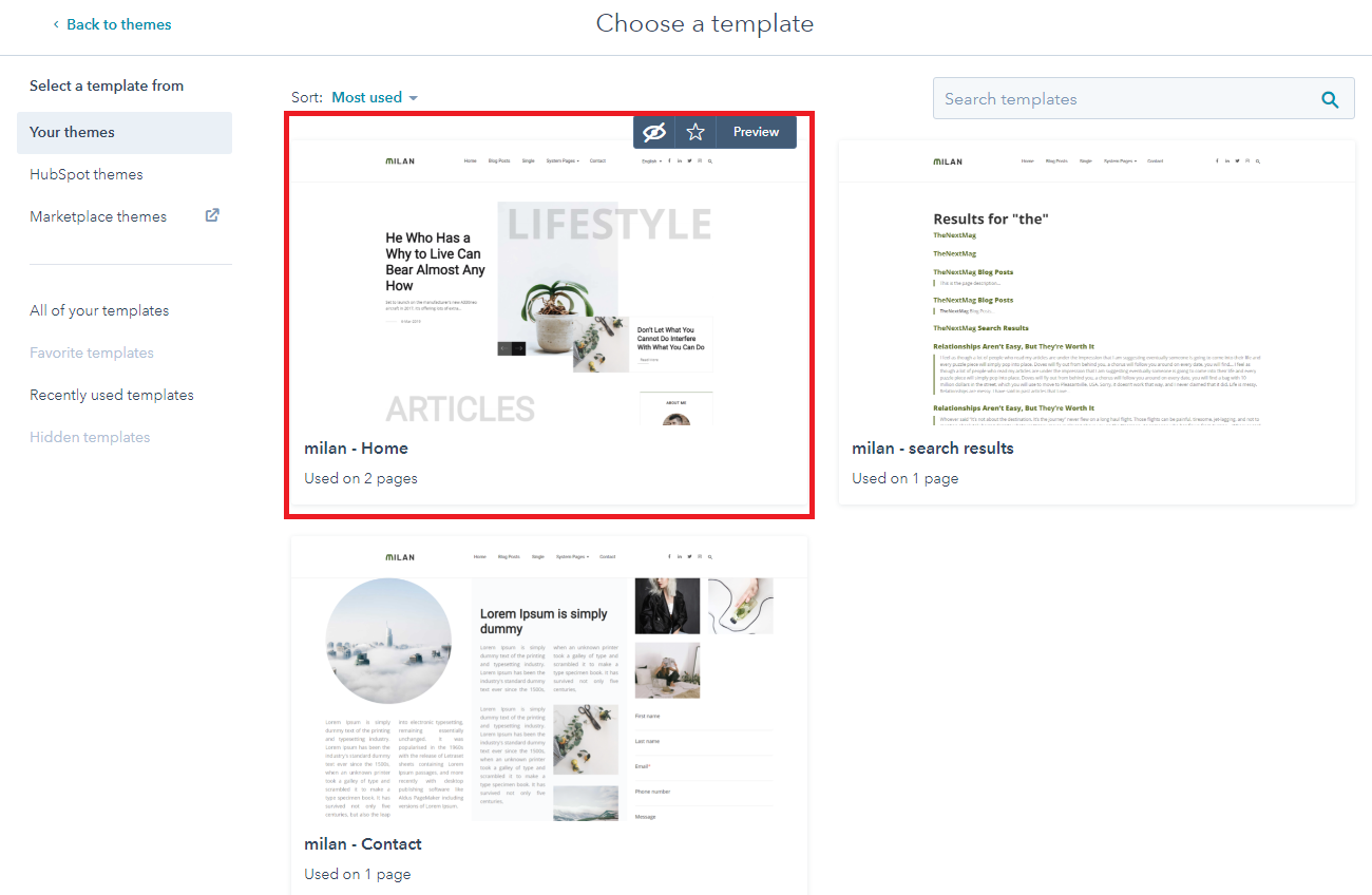 - Choose a template from your newly uploaded theme by selecting the CMS Theme Milan.