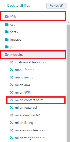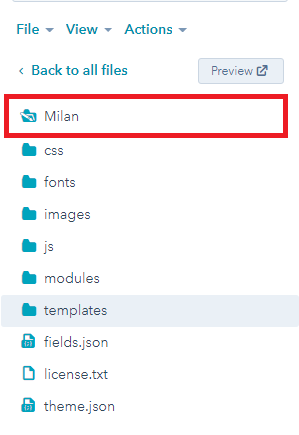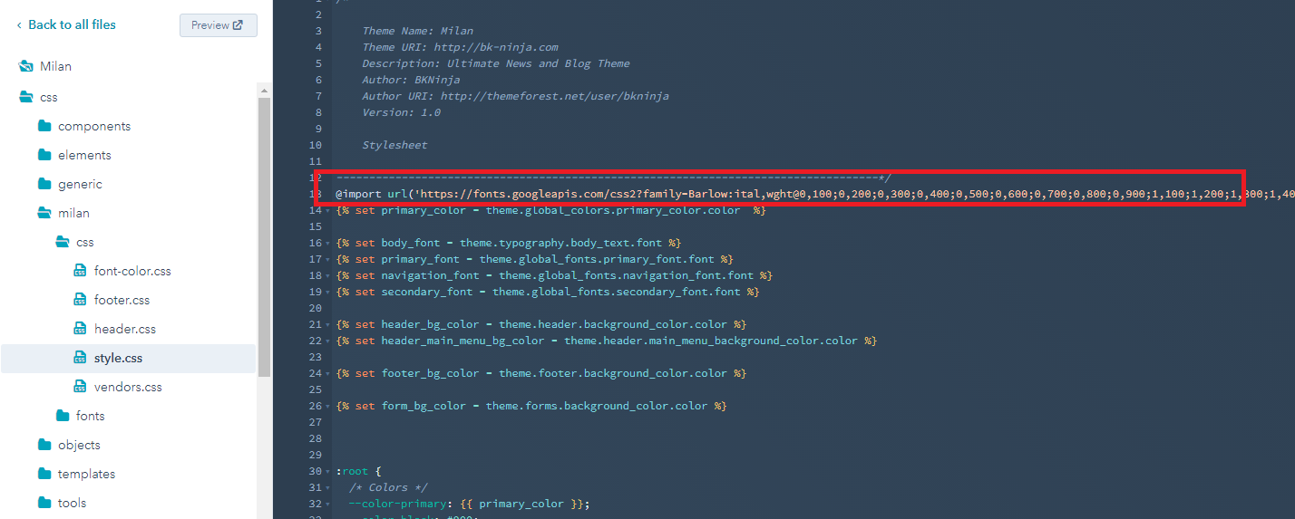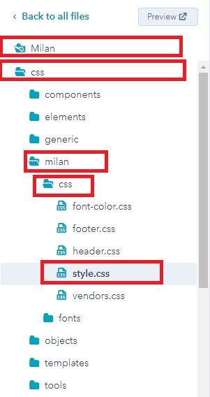 - In left sidebar, choose Milan > css > Milan > css > style.css .