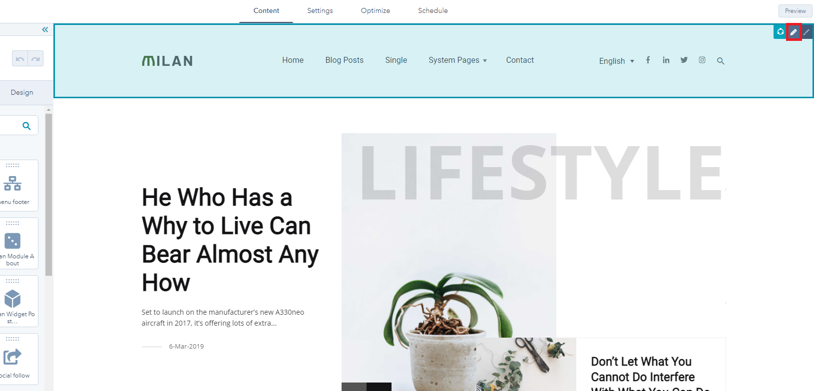 - Some module types, such as headings, can be edited inline directly on the page preview. Clicking a module will also open its editing options in the left panel.