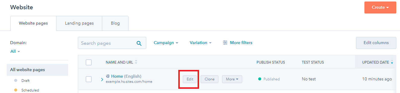 - In HubSpot, navigate to Marketing > website > website Pages.