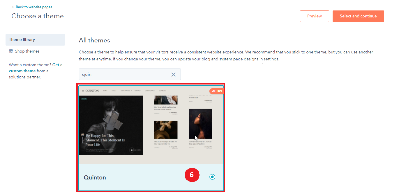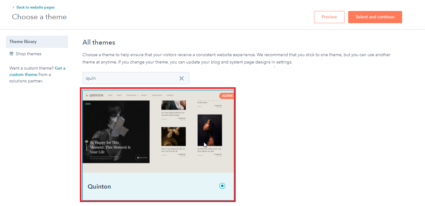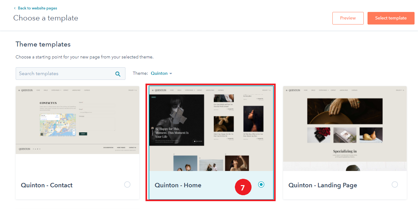 - Choose a template from your newly uploaded theme by selecting the CMS Theme quinton.