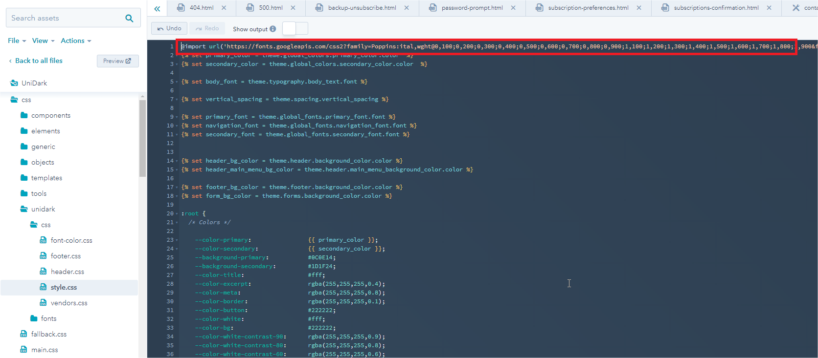 - In right sidebar, choose @import, and copy this code below @import.