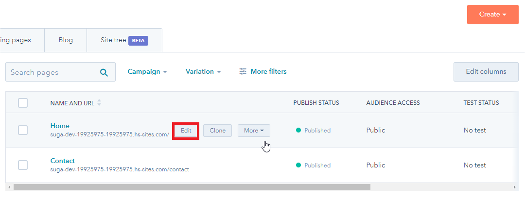 - In HubSpot, navigate to Marketing > website > website Pages.