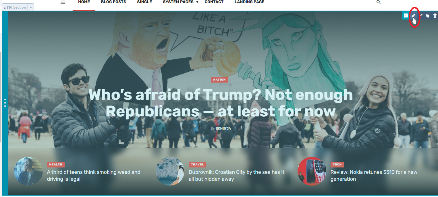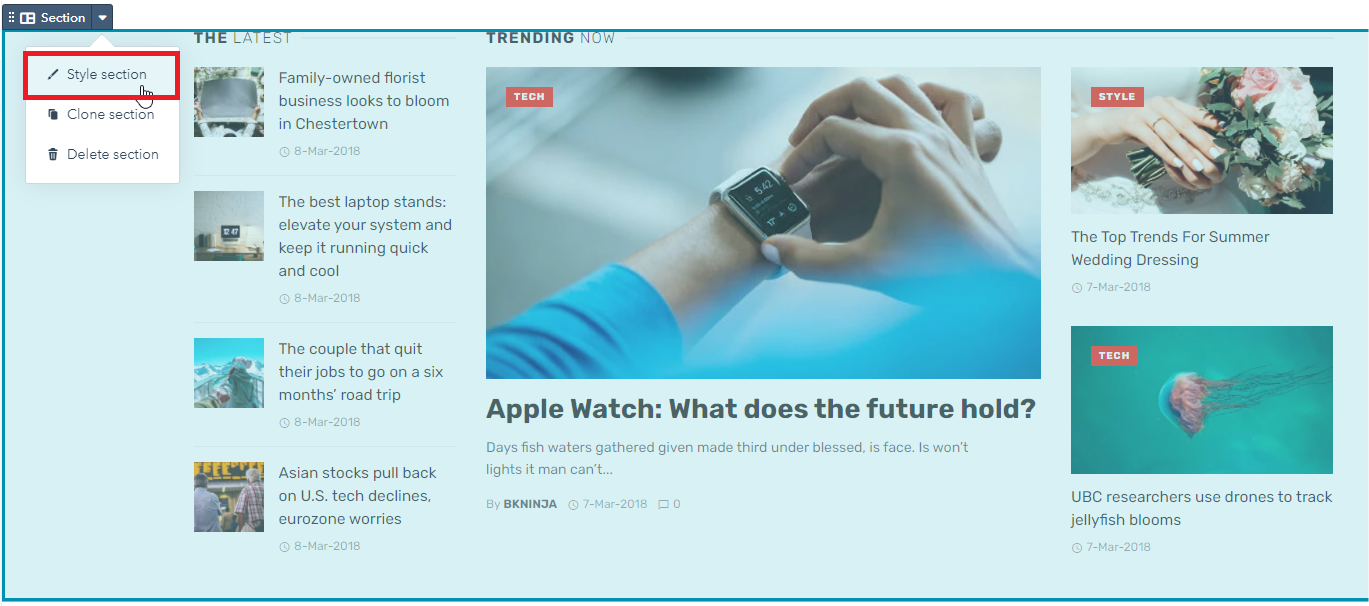 - After drag module move mouse to the section then click icon dropdown and choose Style section