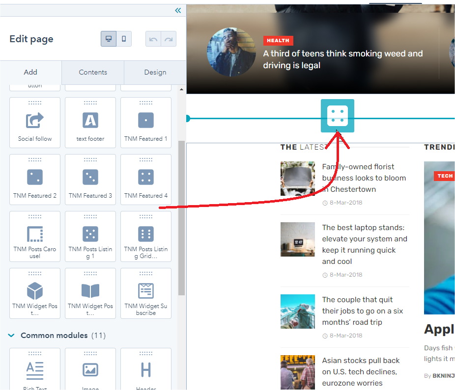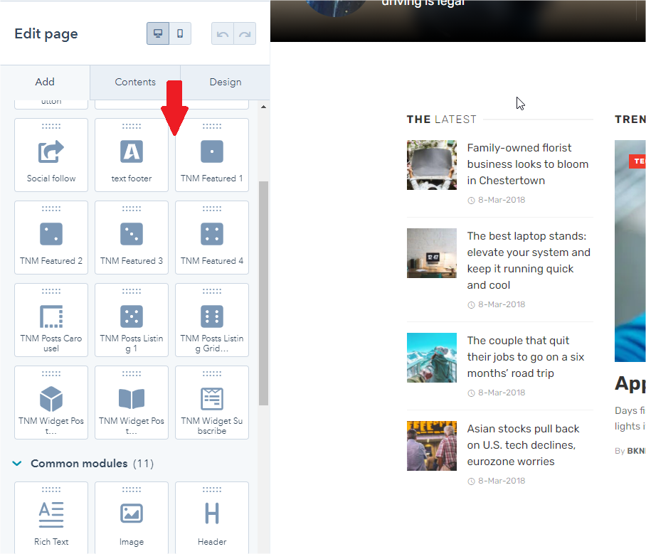 Note*: In the Contents tab on the left, you can view and edit all the modules in your page template. If your page contains global content, such as a page header, you'll edit this in your page within the global content editor.