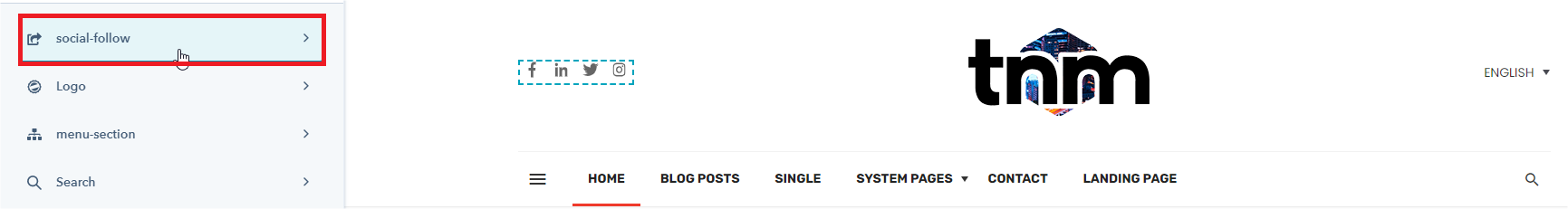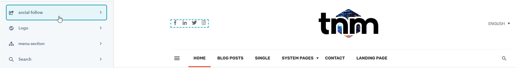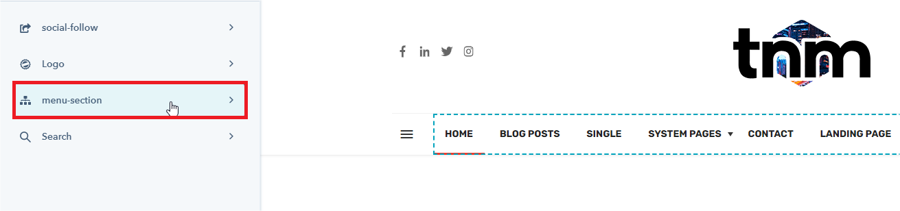 - Hover your mouse above or below an existing menu, then click the + icon and select an item to add to the navigation: