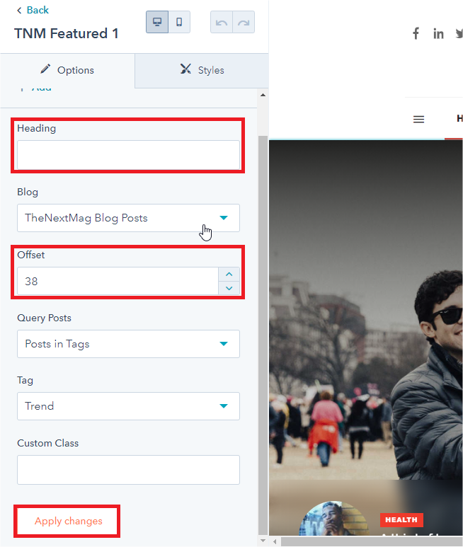 - Choose Module, in field Blog choose blog for module. Then in field Offset set offer for module. Click Aplly changes.