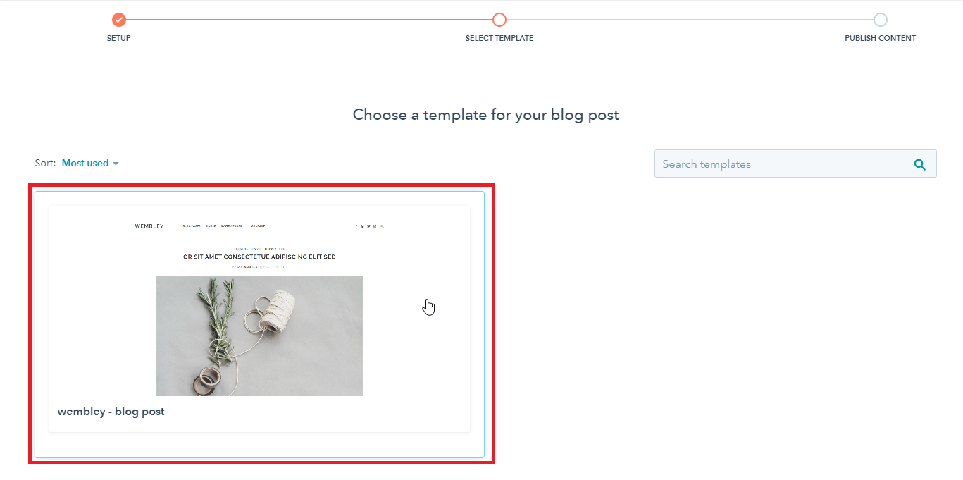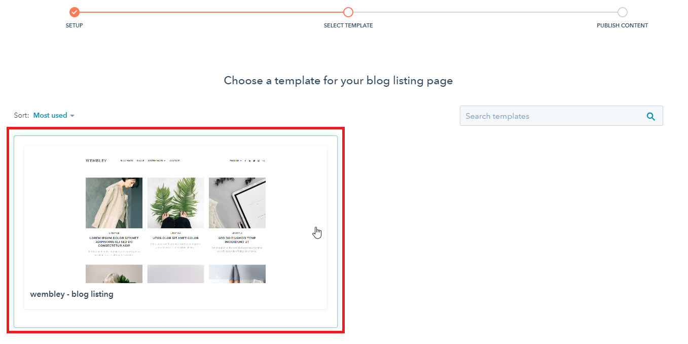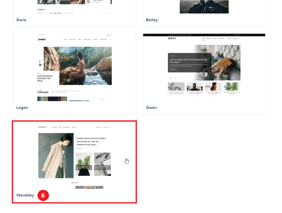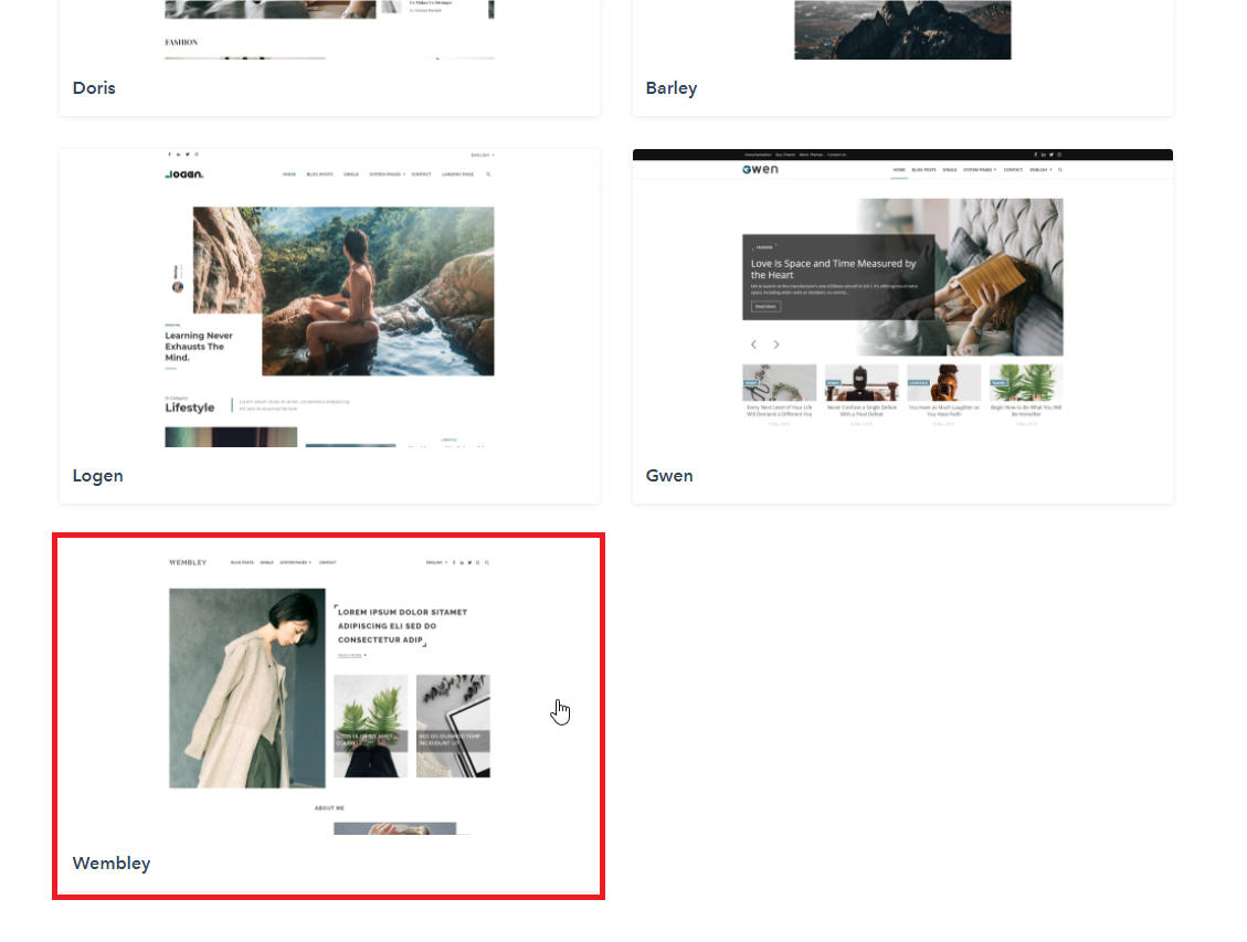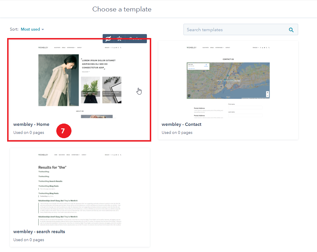 - Choose a template from your newly uploaded theme by selecting the CMS Theme wembley.