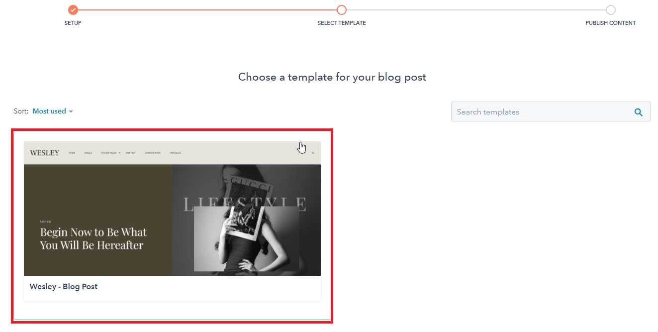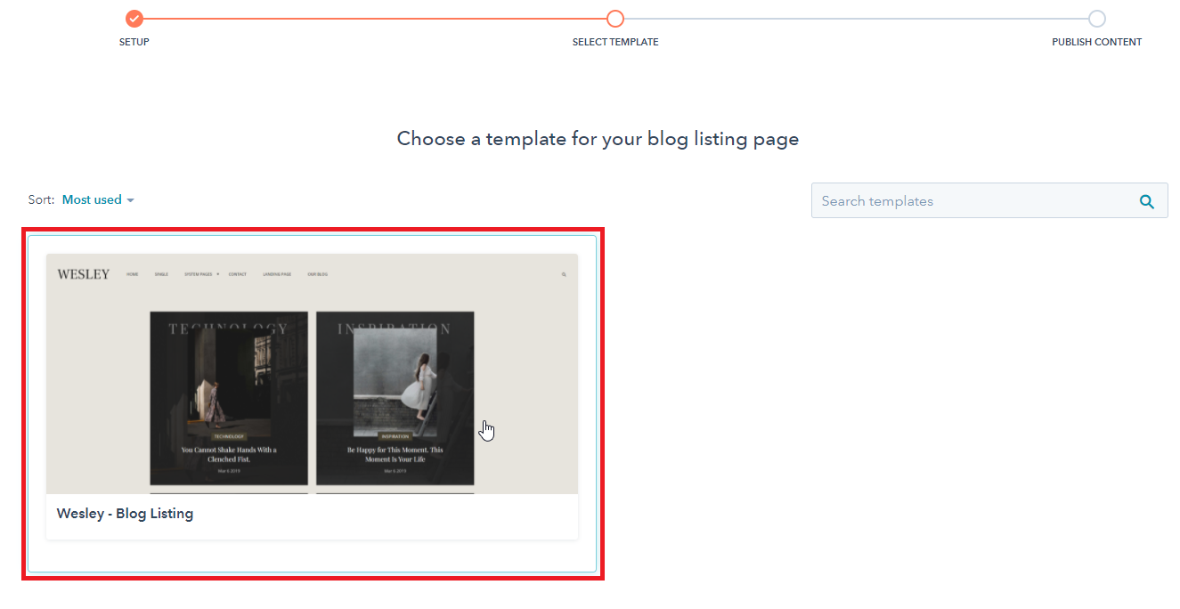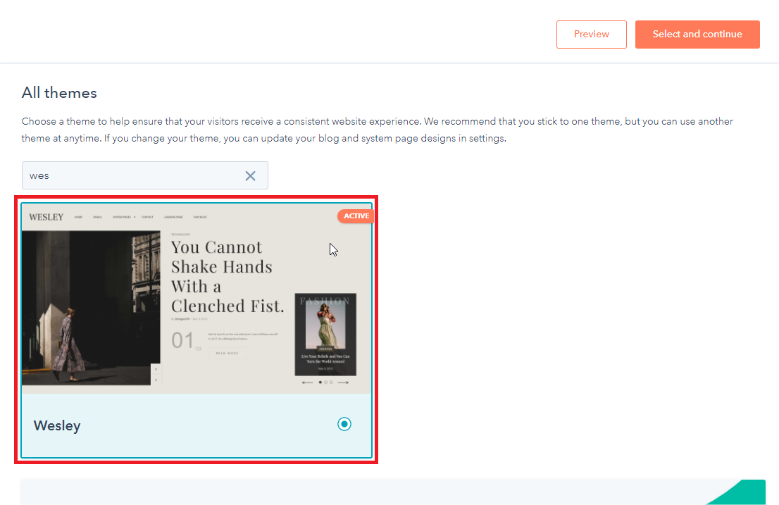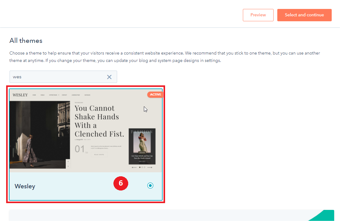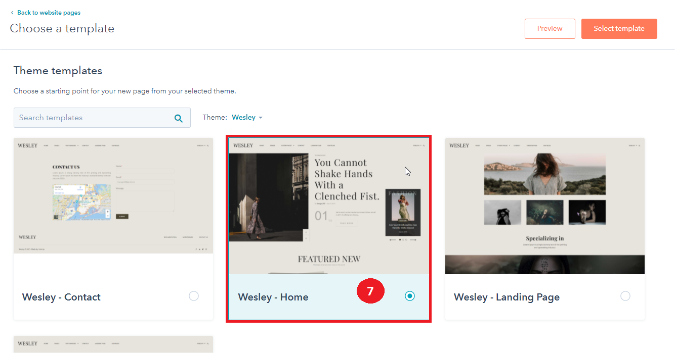 - Choose a template from your newly uploaded theme by selecting the CMS Theme Wesley.