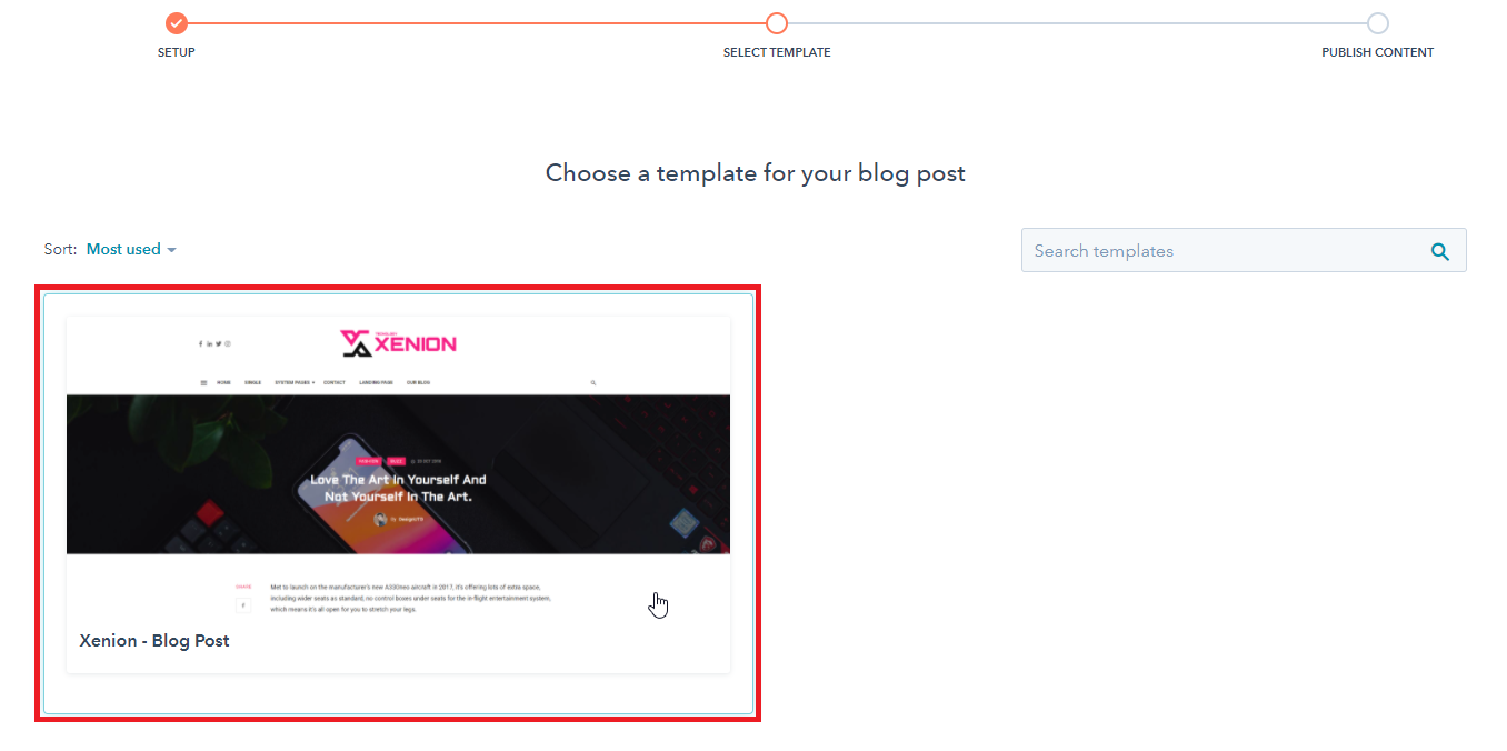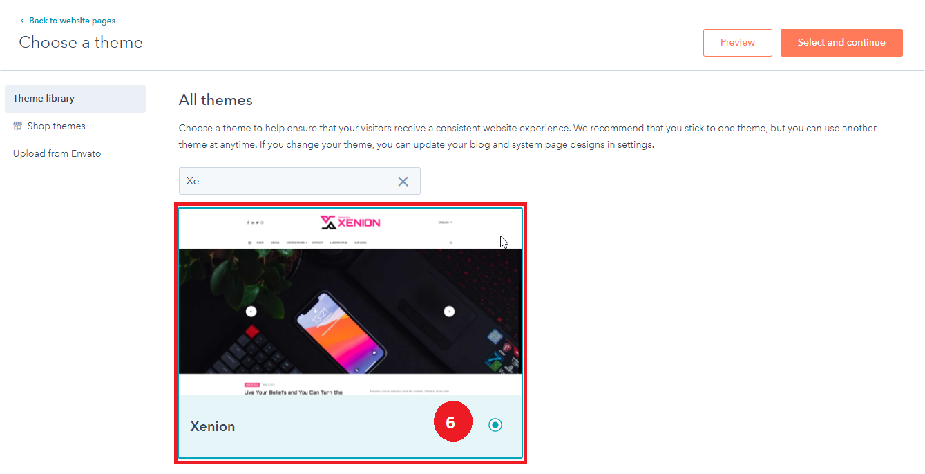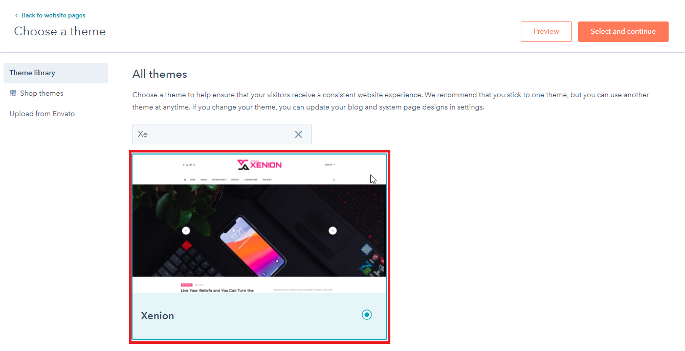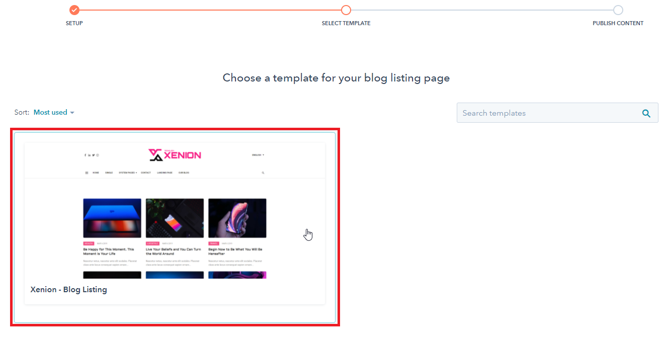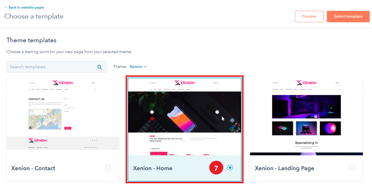 - Choose a template from your newly uploaded theme by selecting the CMS Theme Xenion.
