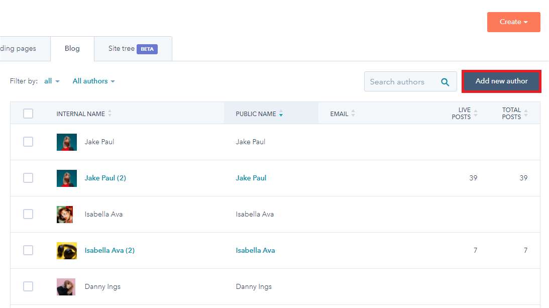 - In your HubSpot account, choose Marketing > Website > Blog > Authors. Click Edit full profile.