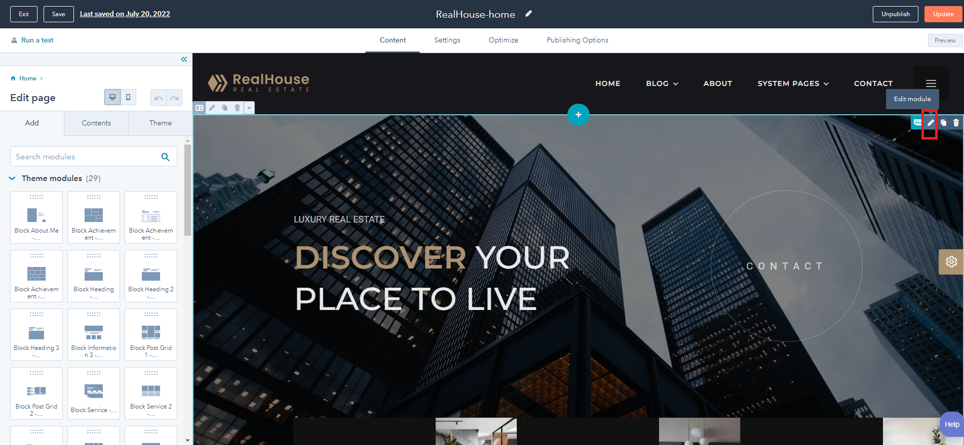 - To edit a module's contents, hover over the module and click the edit pencil icon.